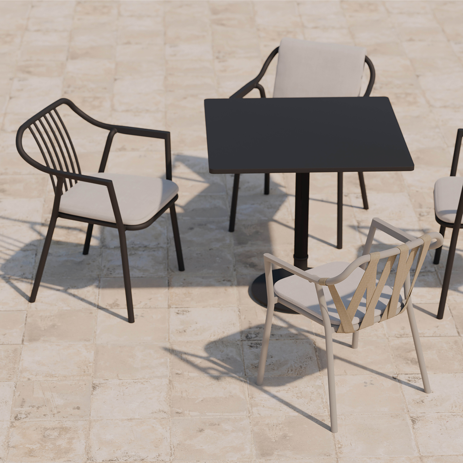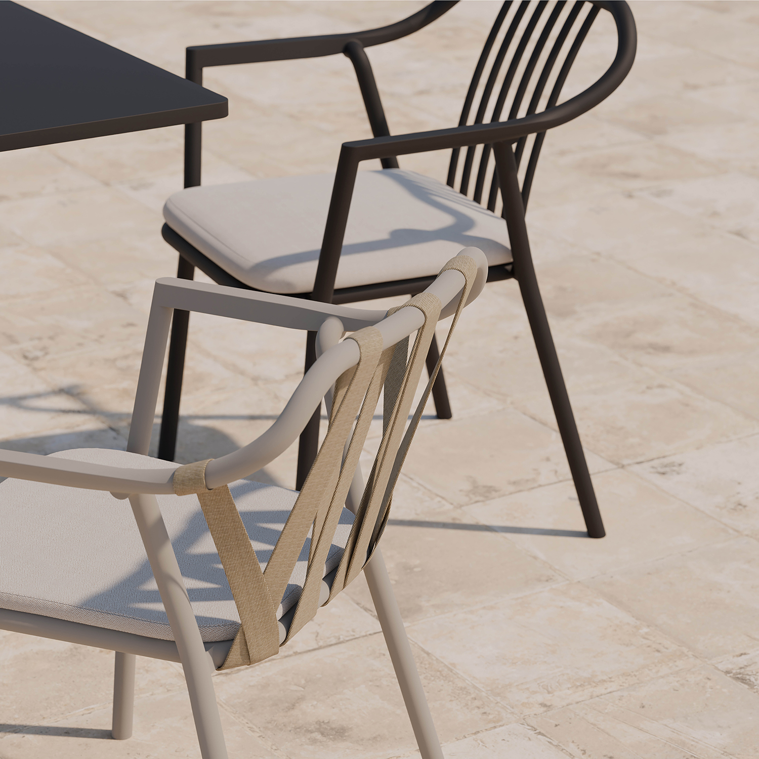 The Monte with straps represents elegant sophistication, the Monte with a completely aluminum back represents simplicity, and the Monte with a back cushion represents comfort.