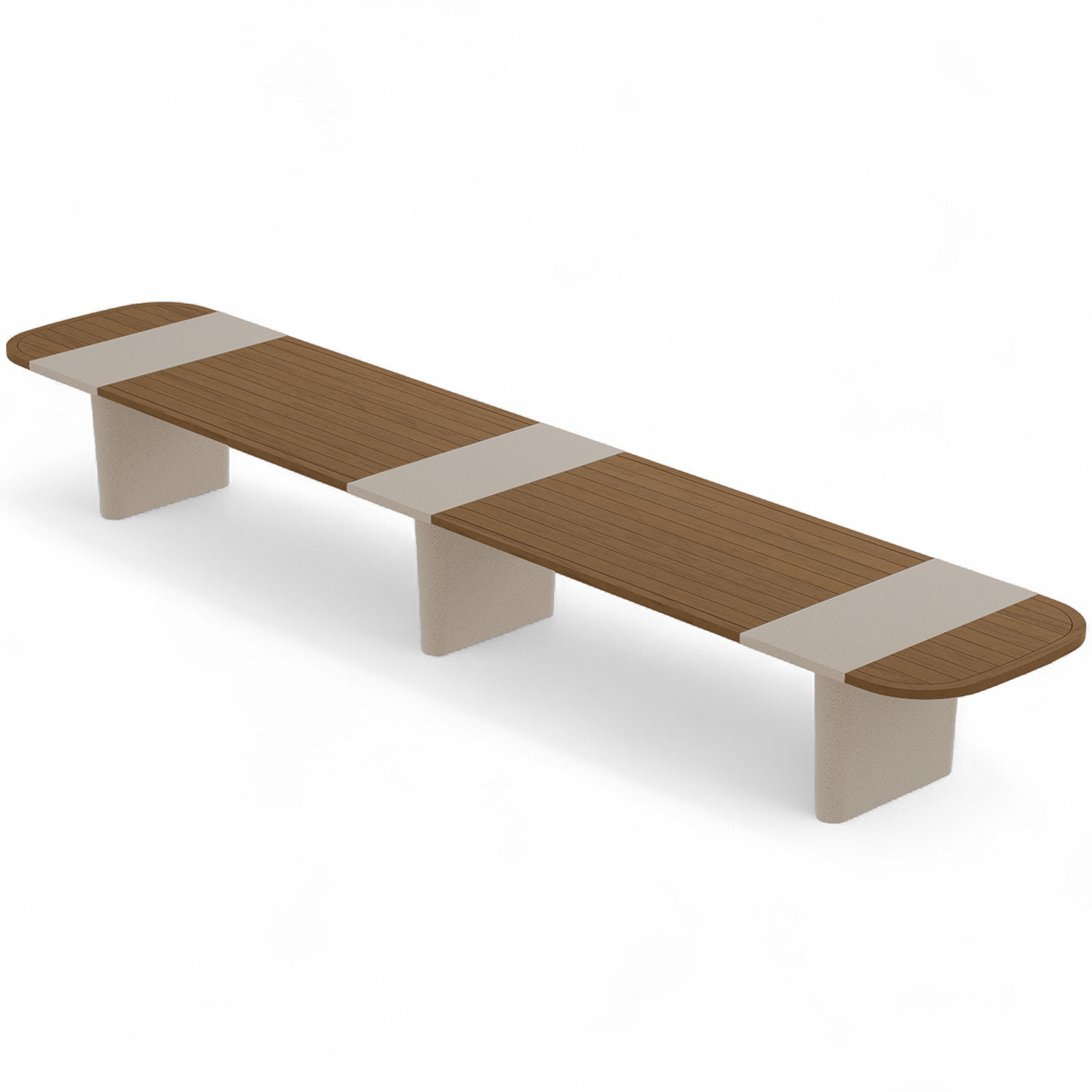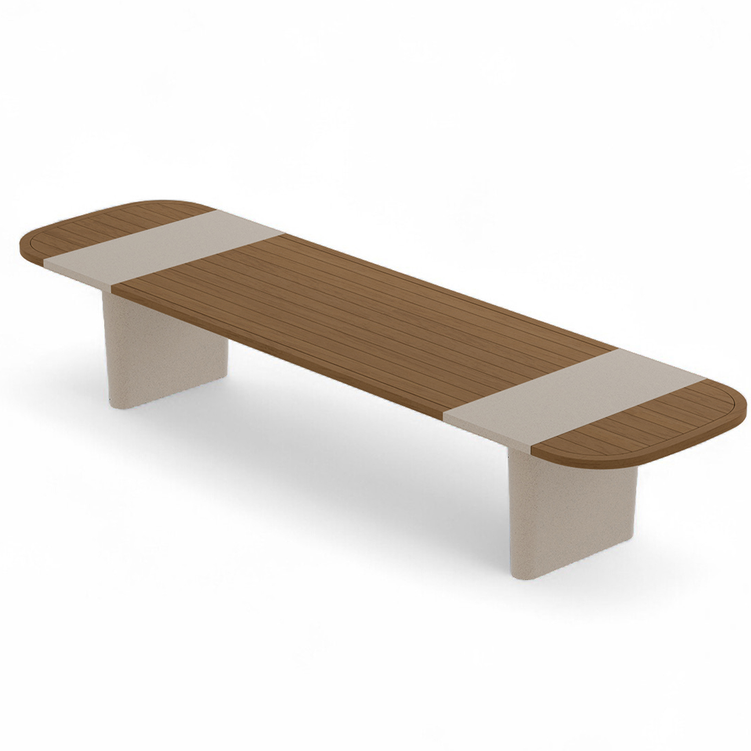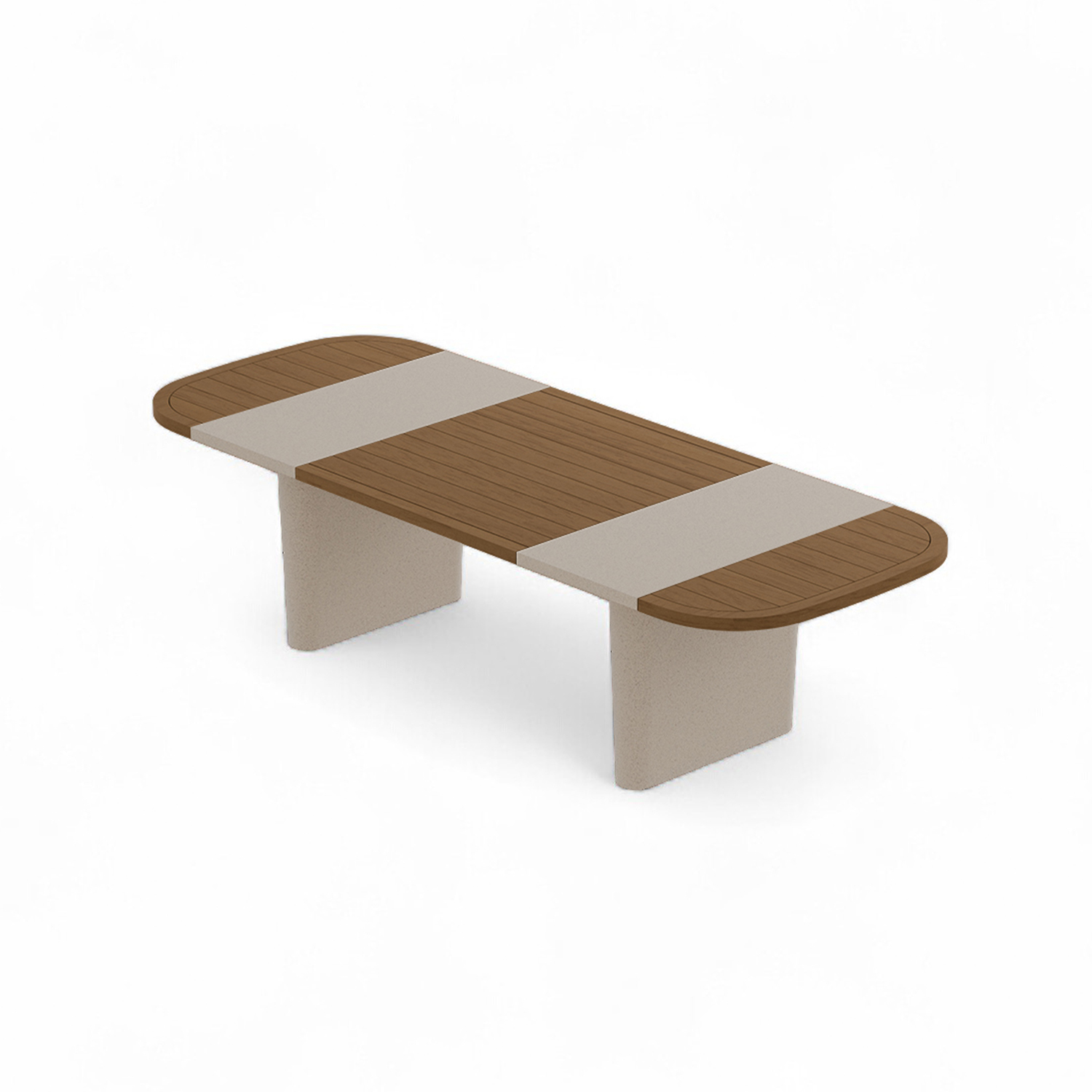 The connecting parts on the legs of SEMT tables made of natural teak wood; aluminum and fiber mixture casting material produced with a special molding method, is completed with sprayed concrete material that provides resistance to bad weather conditions and intensive use.