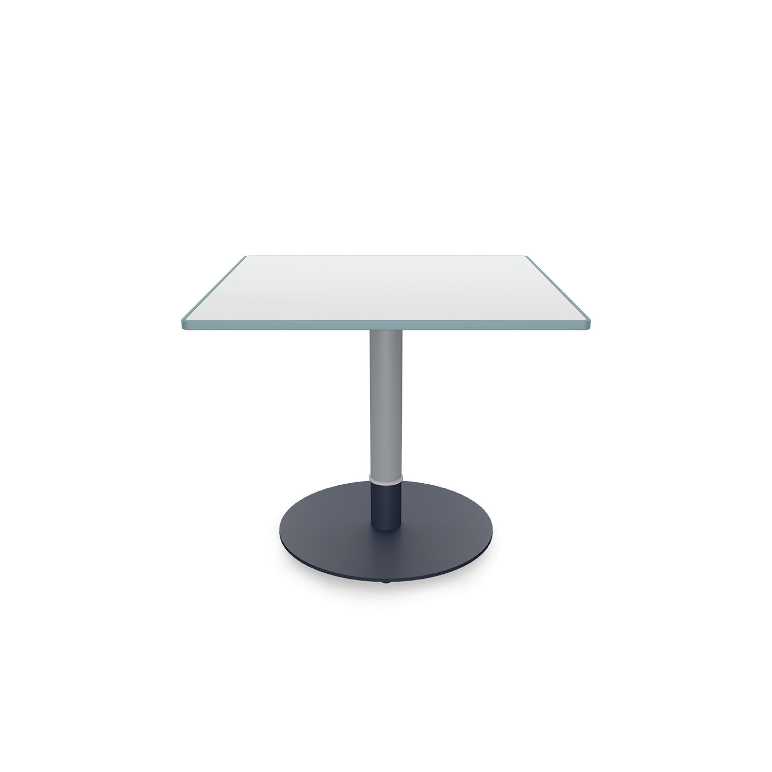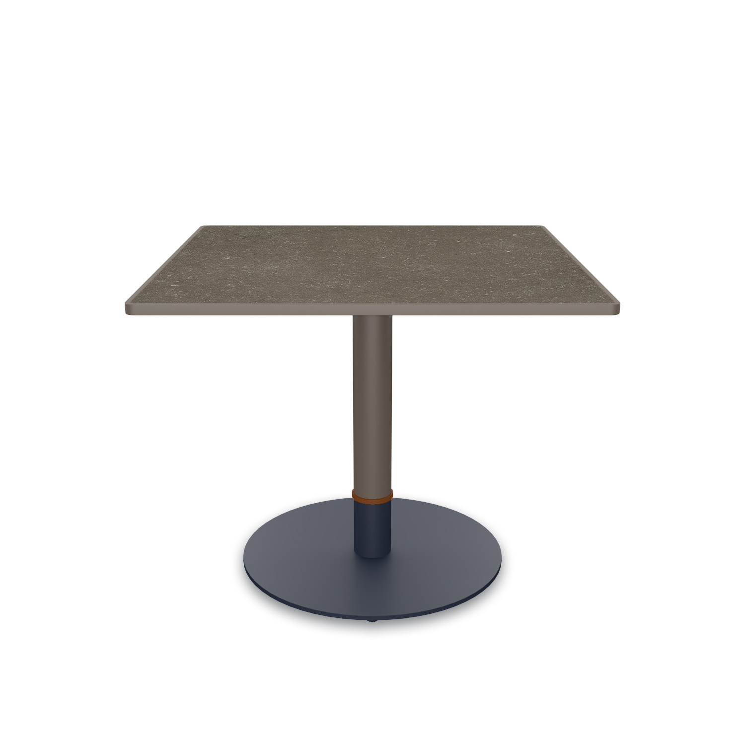 The table leg, which consists of 3 pieces, can be configured with different color combinations. The part that sits on the base is made of heavy-duty stainless material that is resistant to weather conditions. Aluminum, z-pact and paviment alternatives are available for the table.