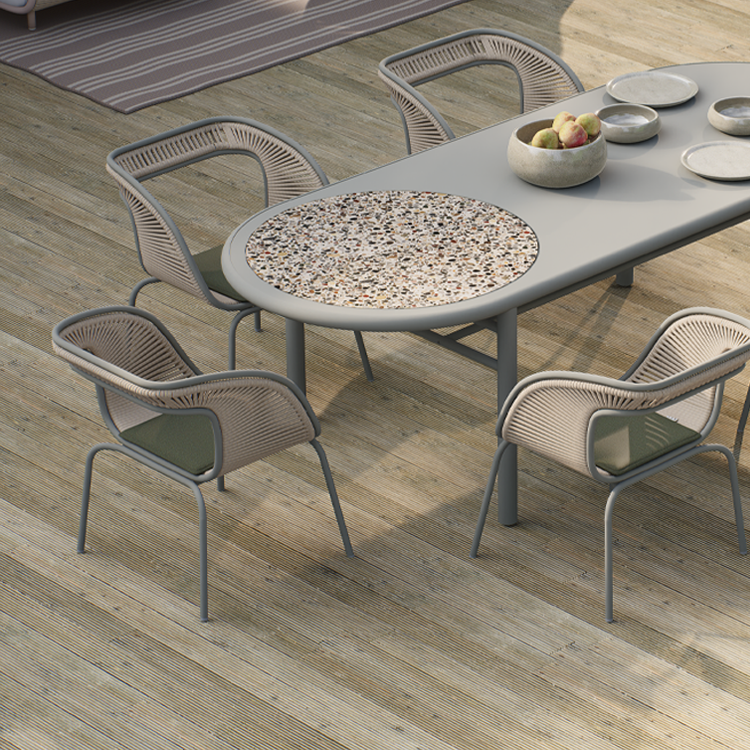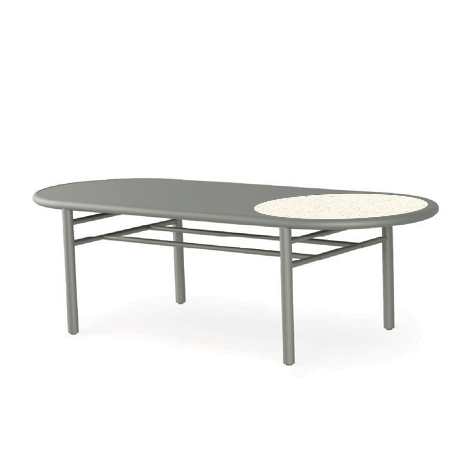 The table follows an elongated profile that is composed in an oval shape. The aluminum structure is characterized by a round insert in Pavement, a composite material with a mottled appearance obtained by a mixture of fragments of marble, granite, basalt, and metal in a cement matrix, or HPL.