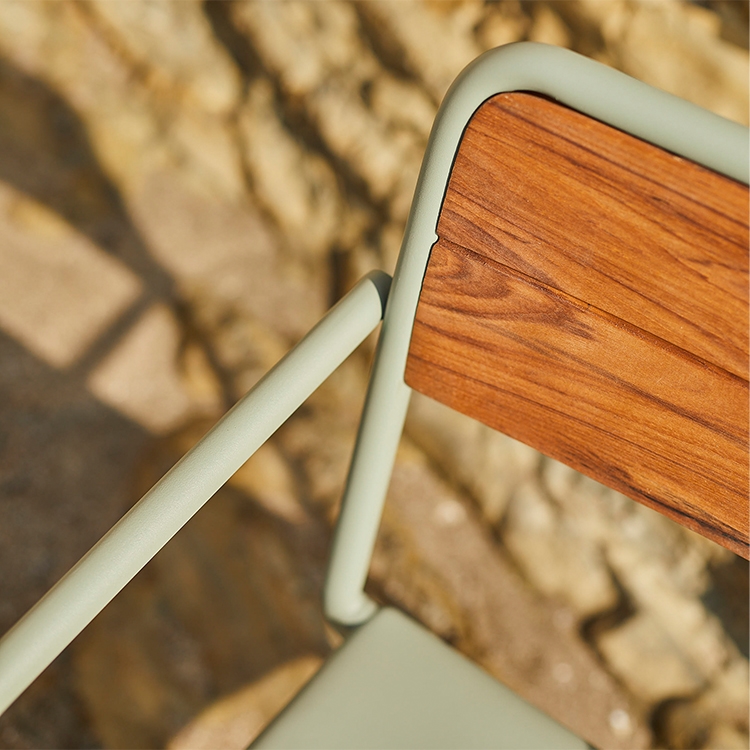 EDI stackable chair can be made entirely of aluminum or with the backrest in original teak.