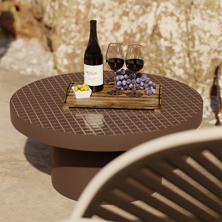 This coffee table collection is characterized by various dimensions, designed to enrich any lounge area, both indoors and outdoors. The combination of porcelain and aluminum colors allows for the creation of elegant and refined environments, seamlessly adapting to any space or style.