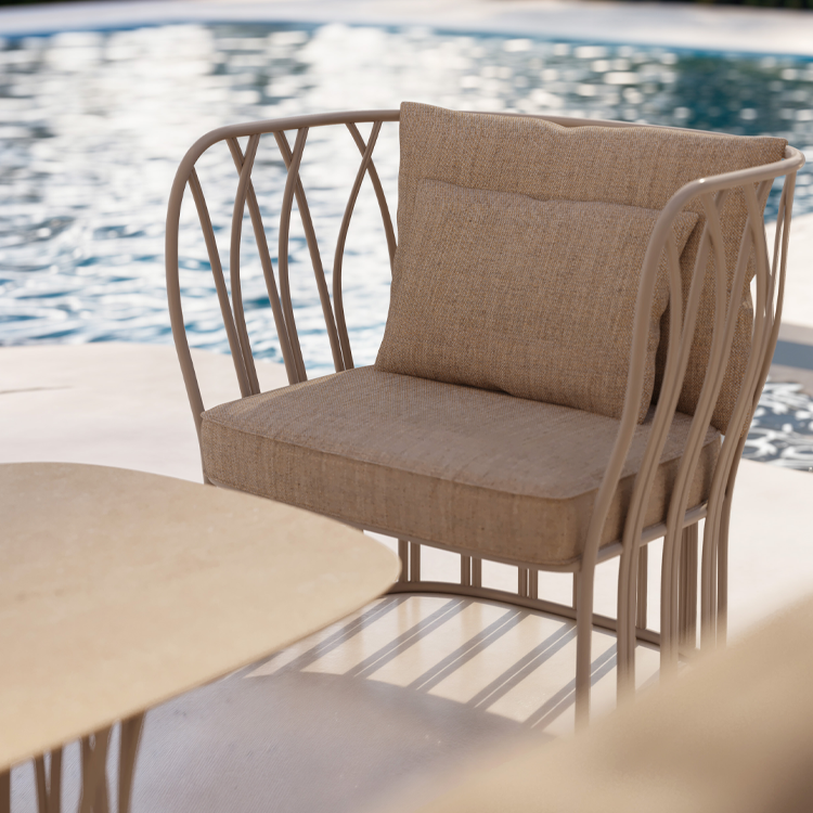 The airy structures are made even more inviting by soft outdoor cushions, which add warmth and comfort to the metal’s rigor. Each piece invites relaxation, transforming outdoor spaces into havens of well-being and conviviality.