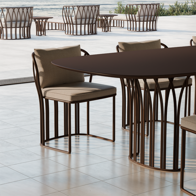 The airy structures are made even more inviting by soft outdoor cushions, which add warmth and comfort to the metal’s rigor. Each piece invites relaxation, transforming outdoor spaces into havens of well-being and conviviality.