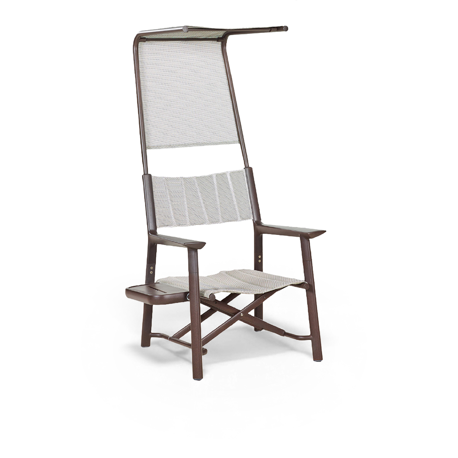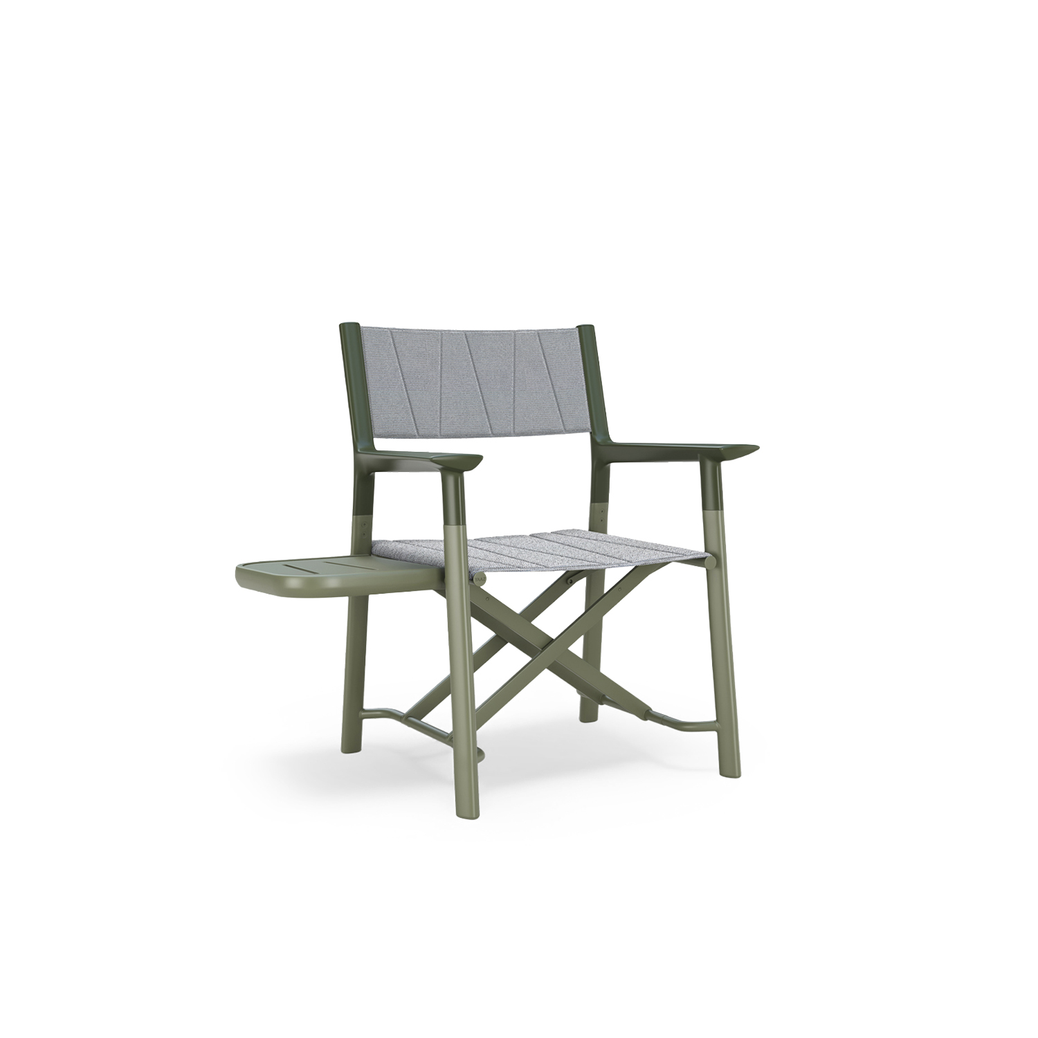 The folding chair draws inspiration from the historical furniture of noble country estates. Made from aluminum, this product evokes the refined and charming holiday destinations of a bygone era. The legs and the armrests are each triangular in section, with flared armrests for enhanced comfort. The seating section, composed of quilted and padded bands, presents a textured visual display, while the seat back is created by weaving technical fabrics of Serge Ferrari brand. The chair is available in a wide range of colors and offers optional integrated accessories such as side tables, sunshade canopy and floor lamp.