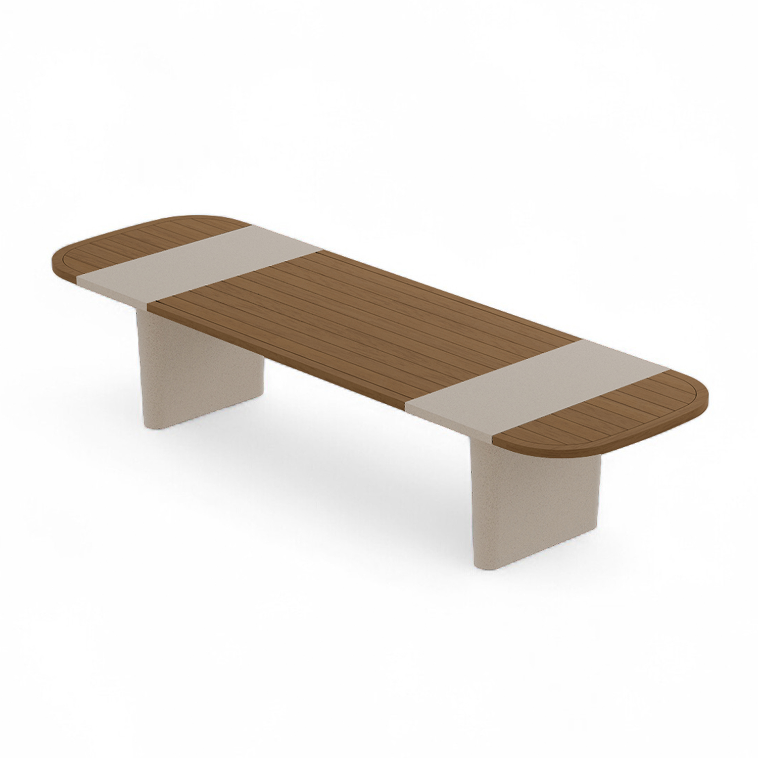 The connecting parts on the legs of SEMT tables made of natural teak wood; aluminum and fiber mixture casting material produced with a special molding method, is completed with sprayed concrete material that provides resistance to bad weather conditions and intensive use.