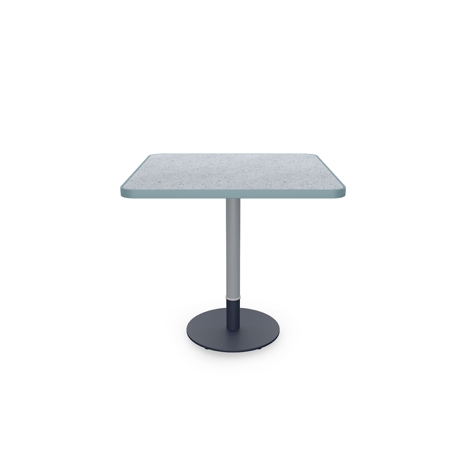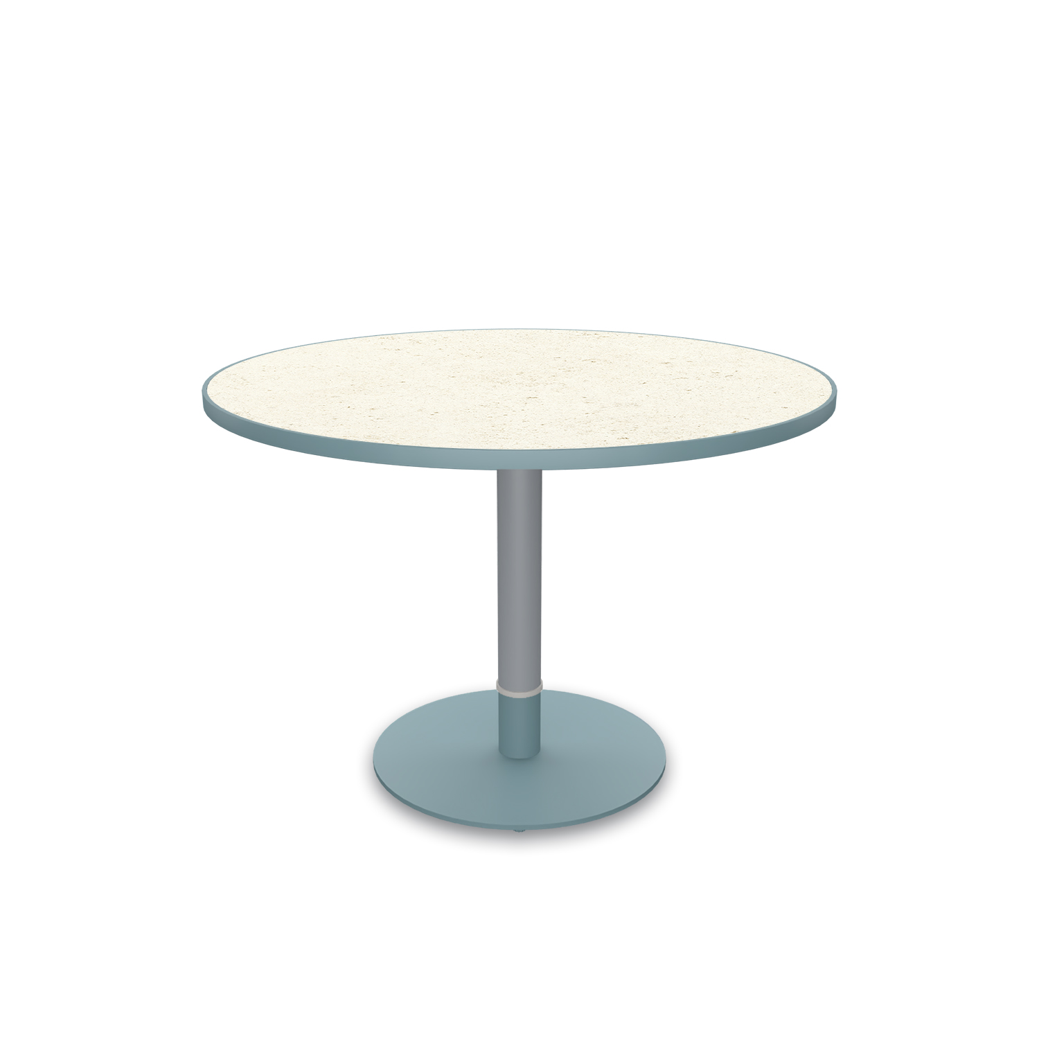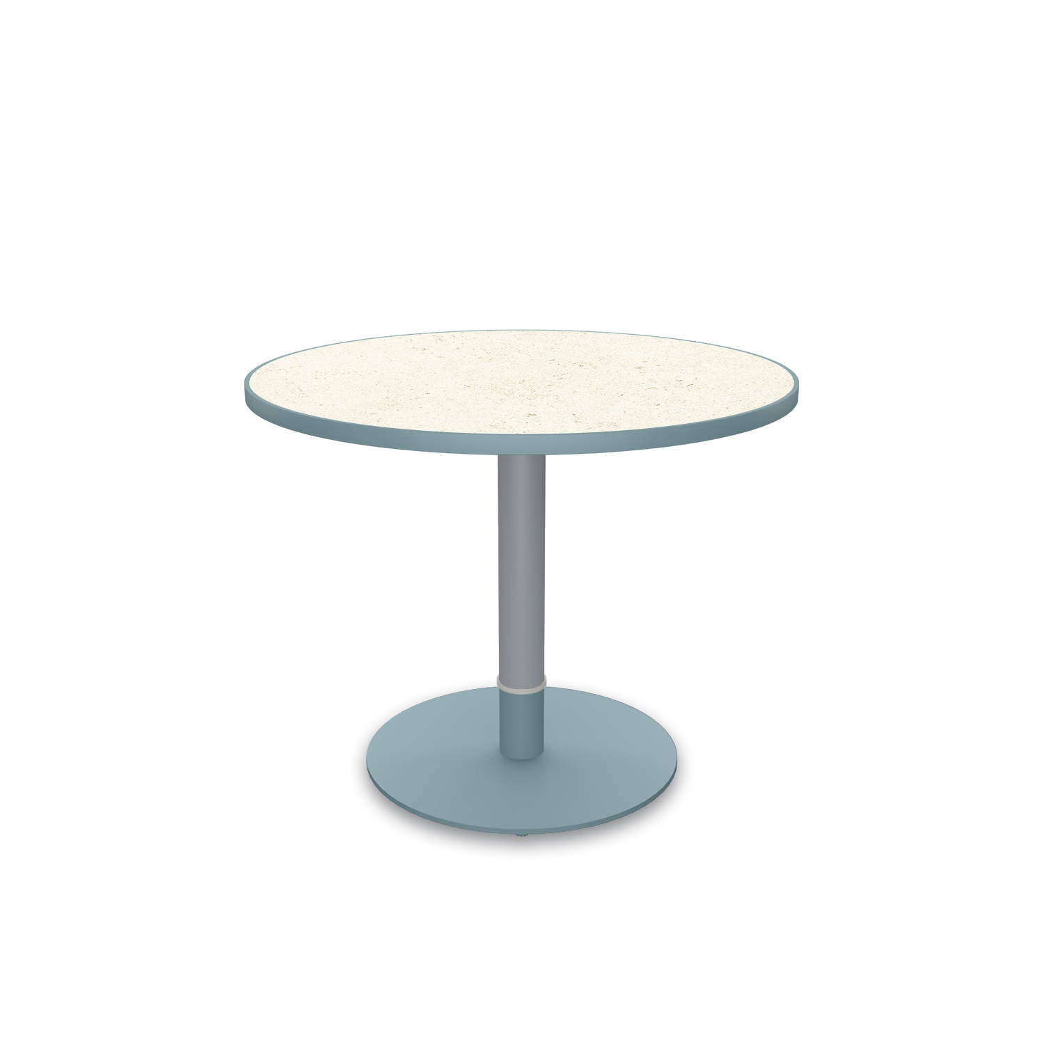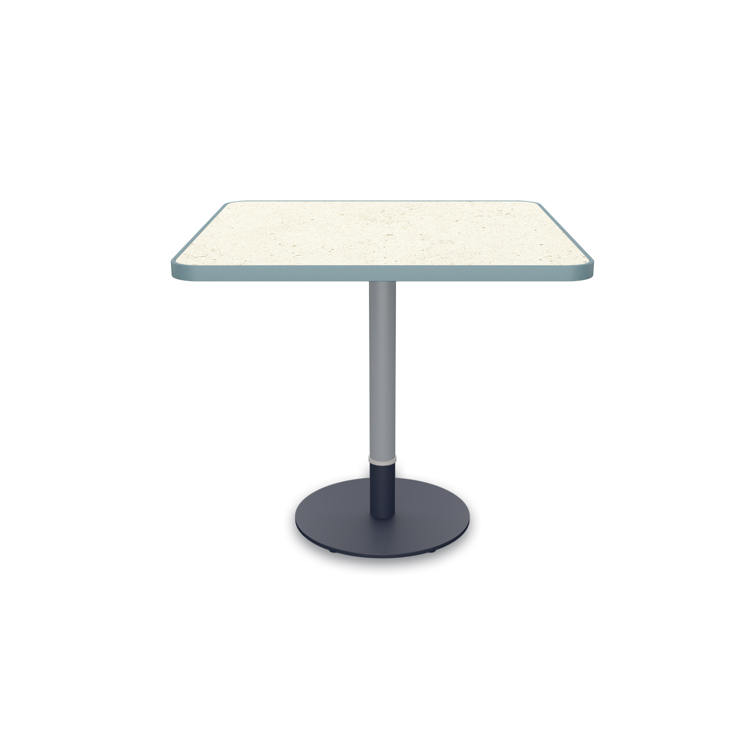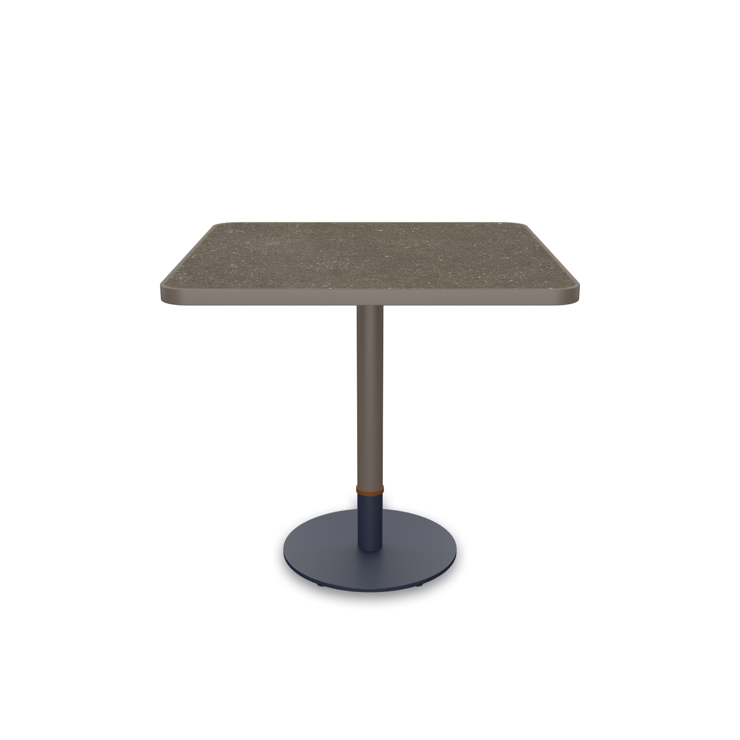 The table leg, which consists of 3 pieces, can be configured with different color combinations. The part that sits on the base is made of heavy-duty stainless material that is resistant to weather conditions. Aluminum, z-pact and paviment alternatives are available for the table.