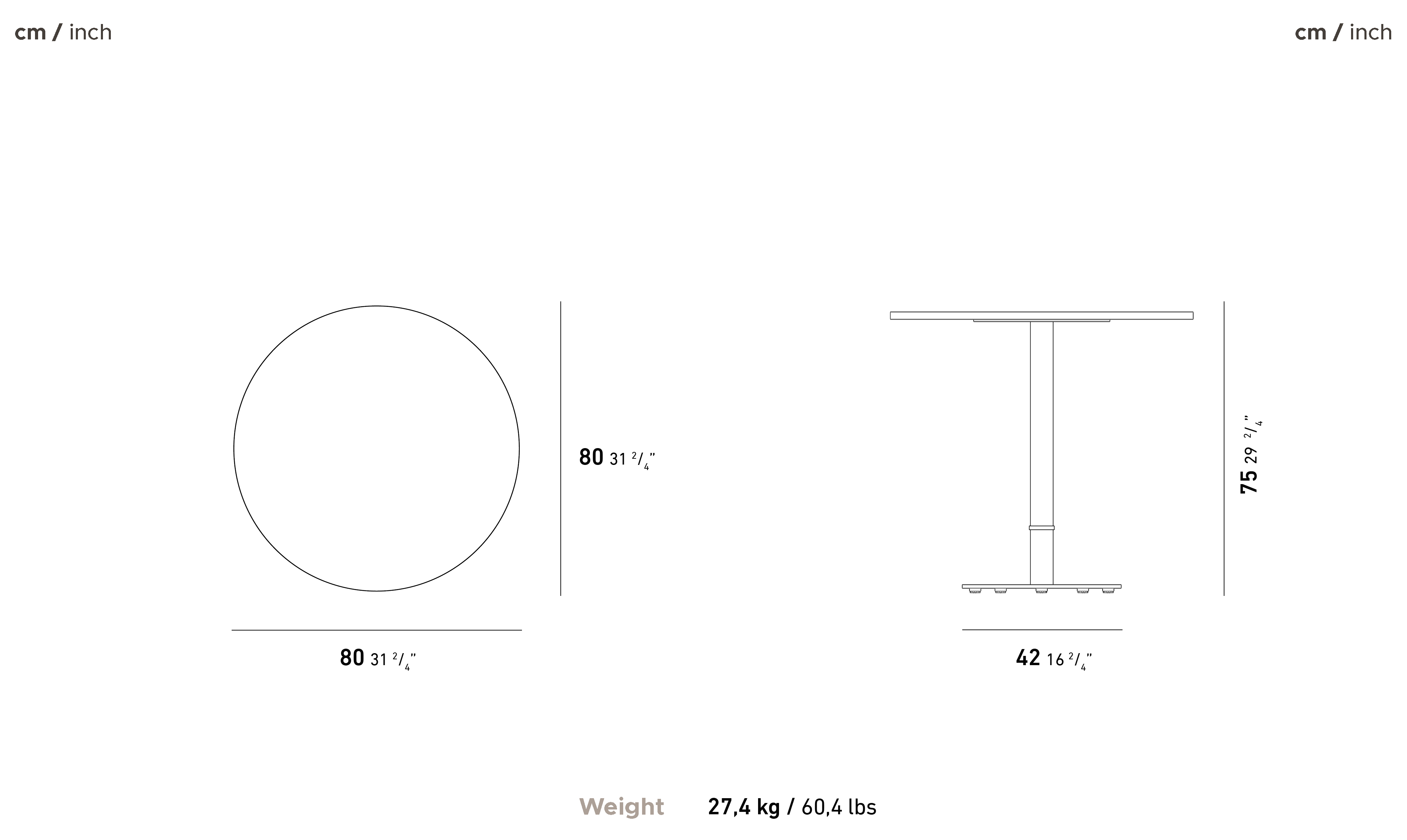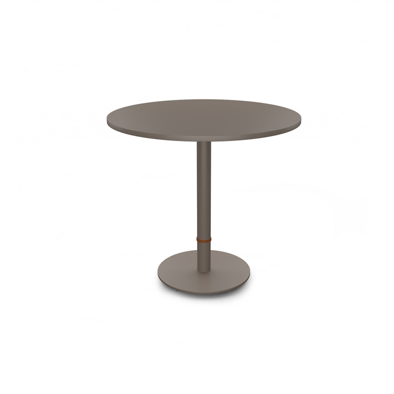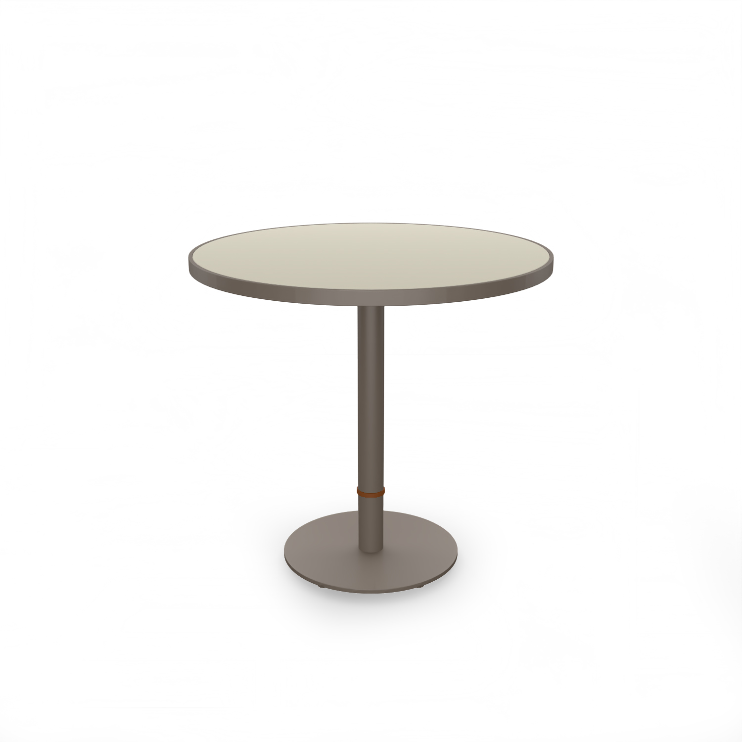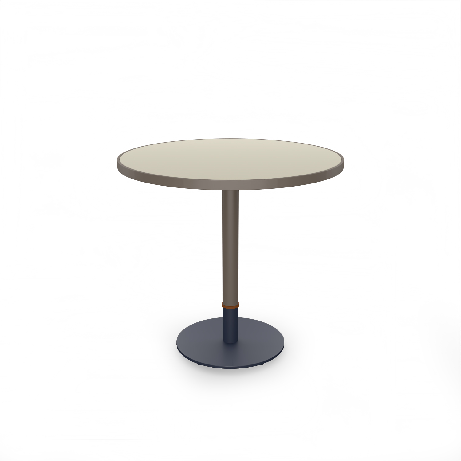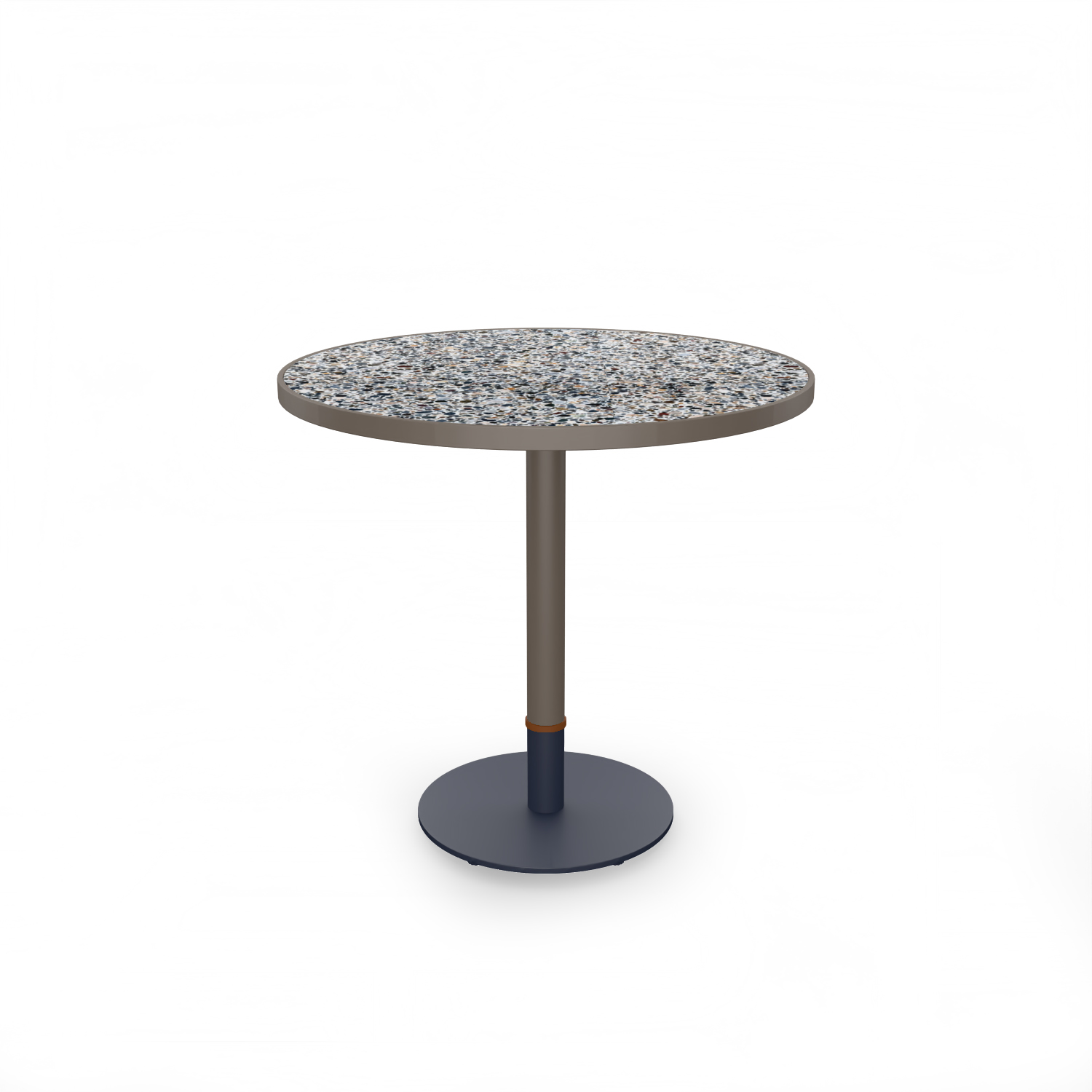 The table leg, which consists of 3 pieces, can be configured with different color combinations. The part that sits on the base is made of heavy-duty stainless material that is resistant to weather conditions. Aluminum, z-pact and paviment alternatives are available for the table.