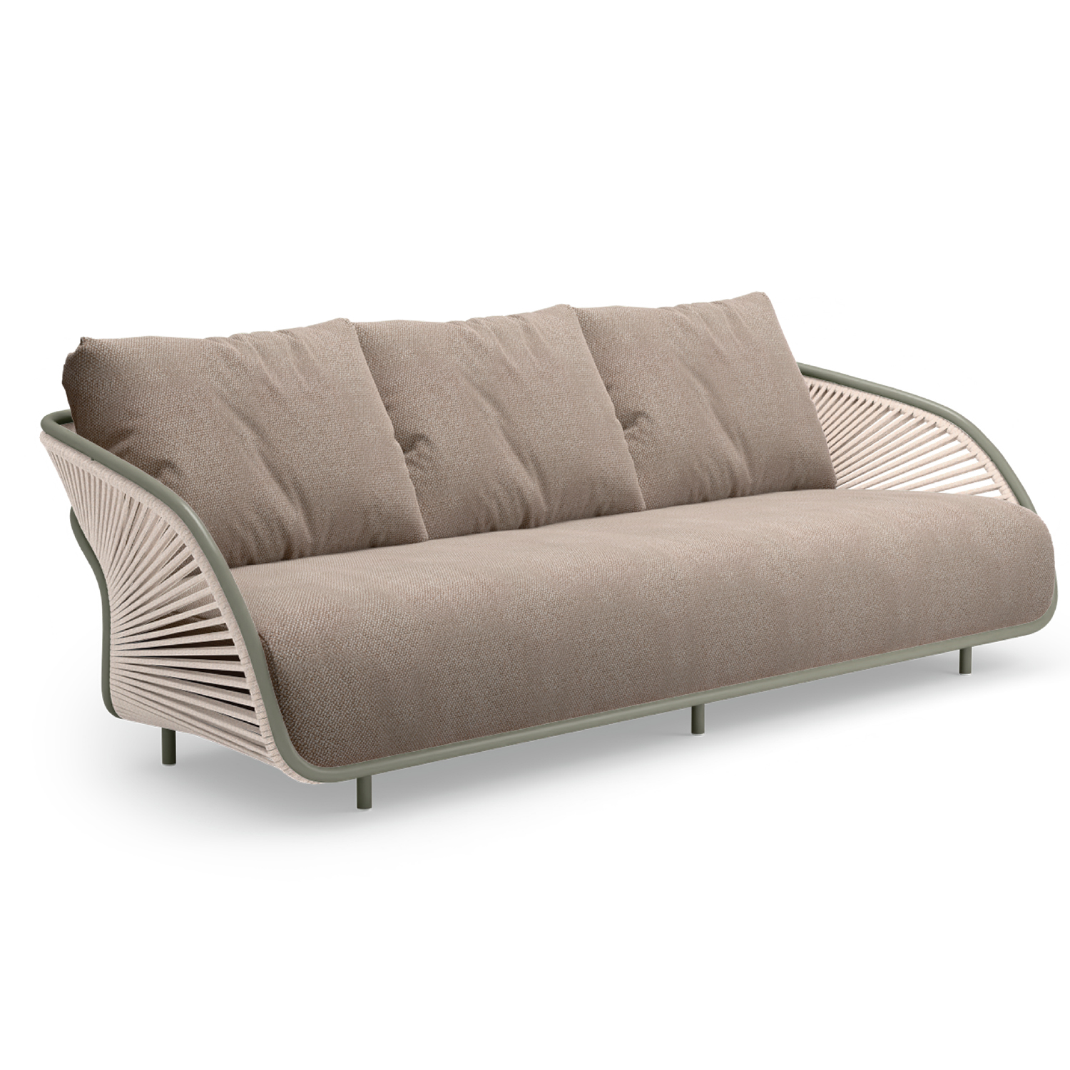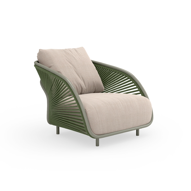 Among these, a rope weaving holds and hosts the wide cushions hinged to the structure.