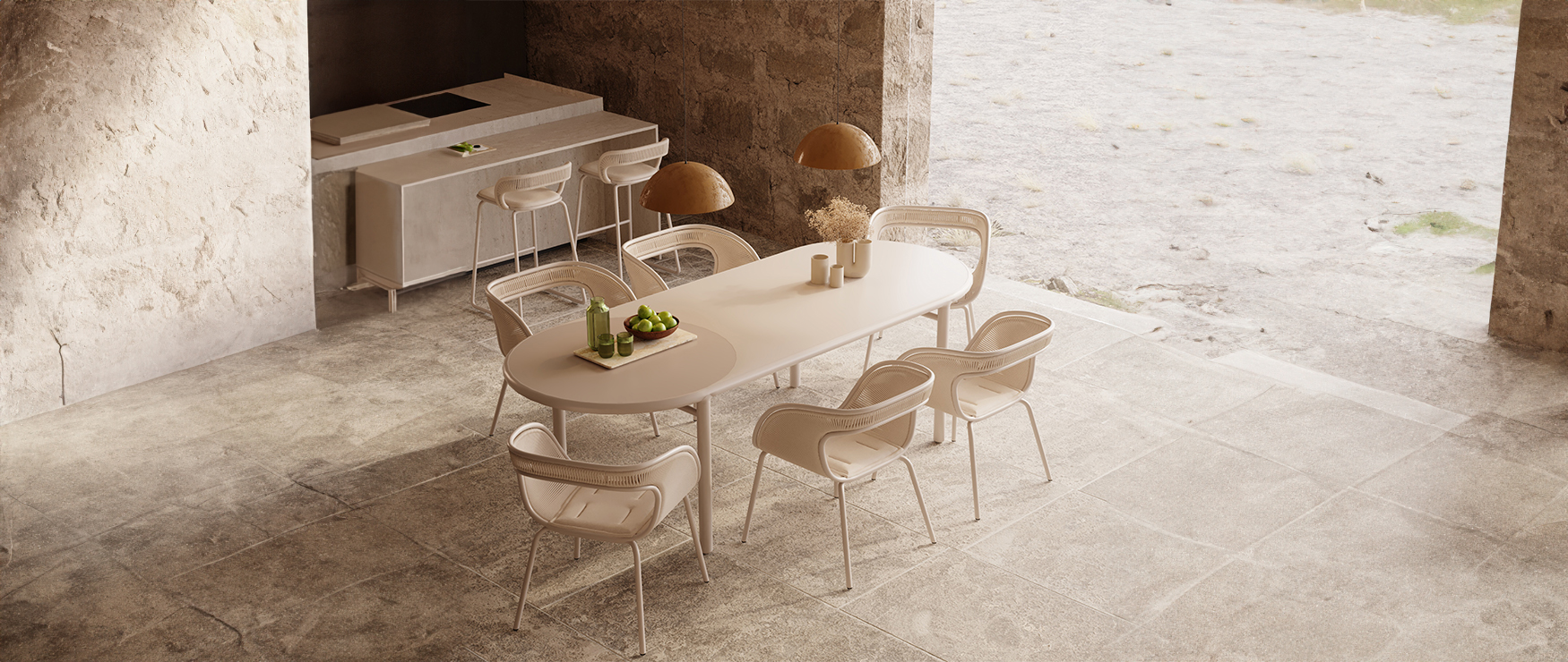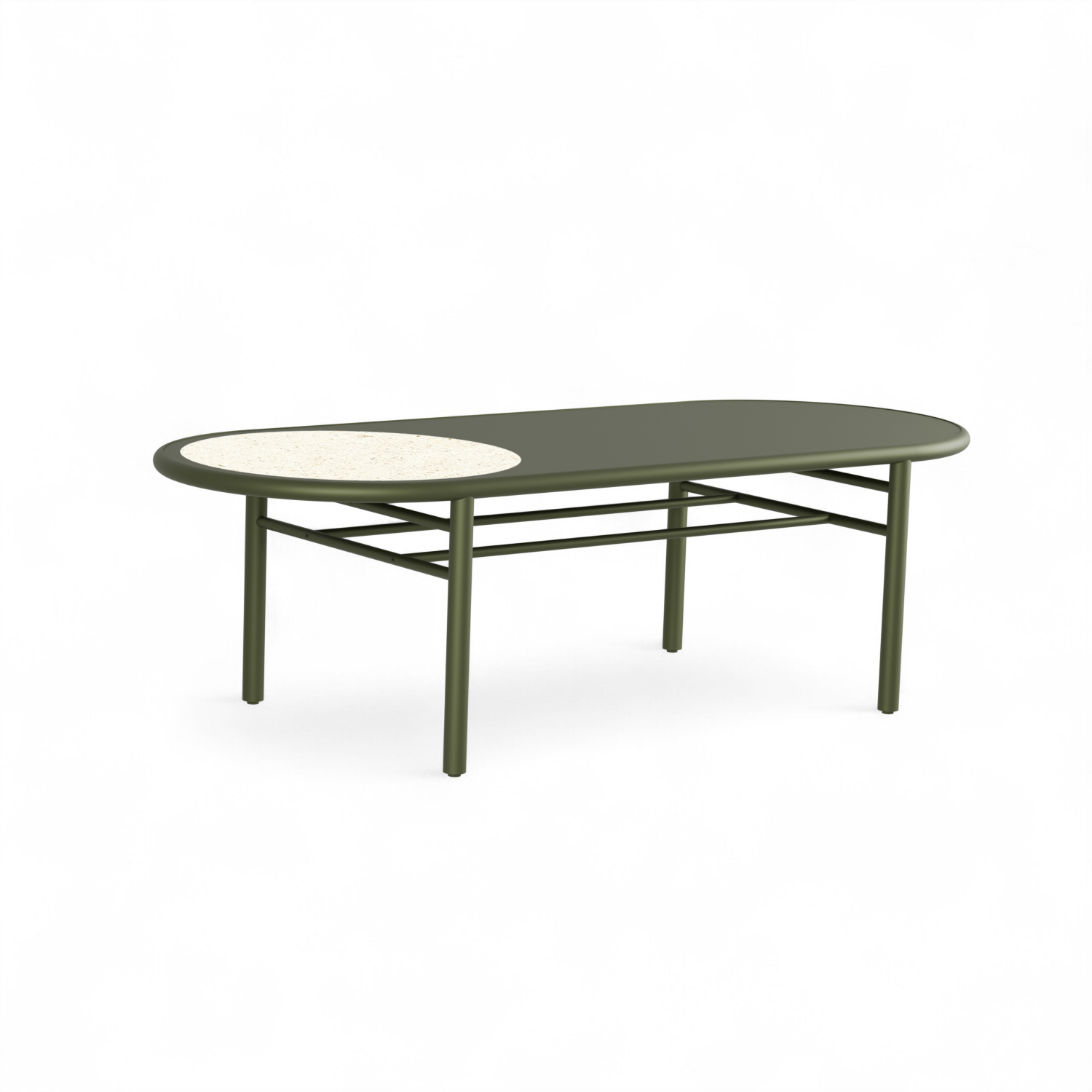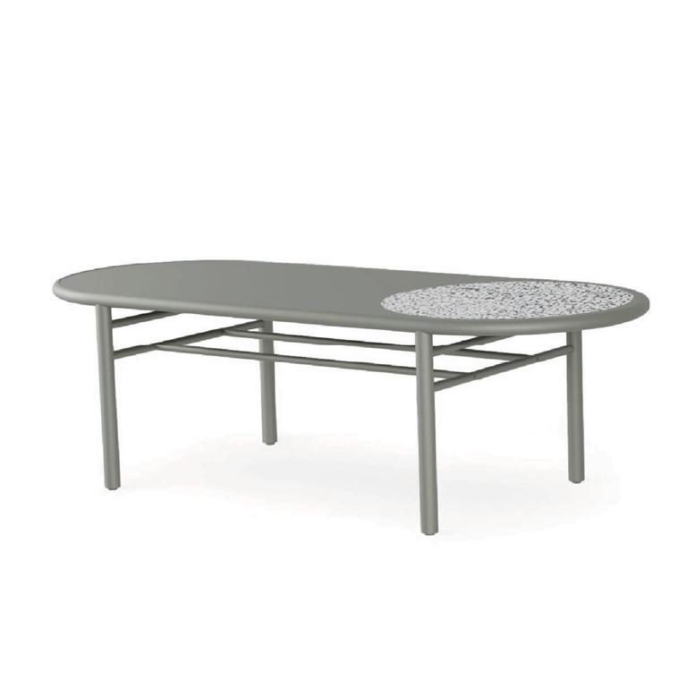 The table follows an elongated profile that is composed in an oval shape. The aluminum structure is characterized by a round insert in Pavement, a composite material with a mottled appearance obtained by a mixture of fragments of marble, granite, basalt, and metal in a cement matrix, or HPL.