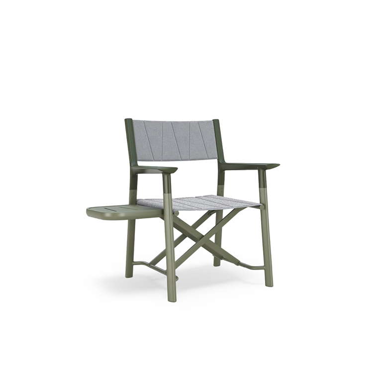 The collection is made of aluminum and fabric to guarantee the utmost lightness, interpreting a refined design concept that results in a triangular cross-section of the legs, armrests. The chair, which provides a quilted and padded seat with Serge Ferrari’s fabrics, offers optional integrated accessories with an openable tray or an add-on sunshade.