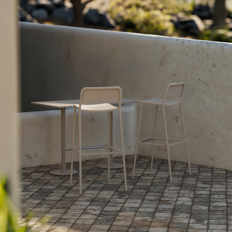 EDI stools can be made entirely of aluminum or with the backrest in original teak.