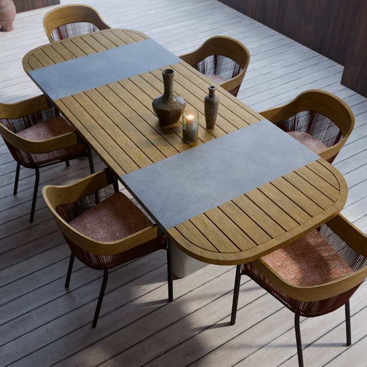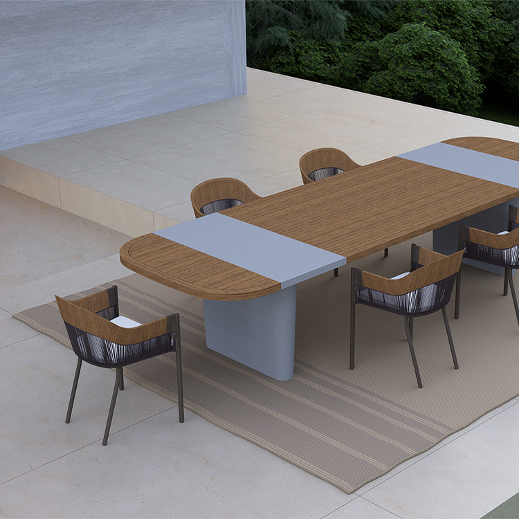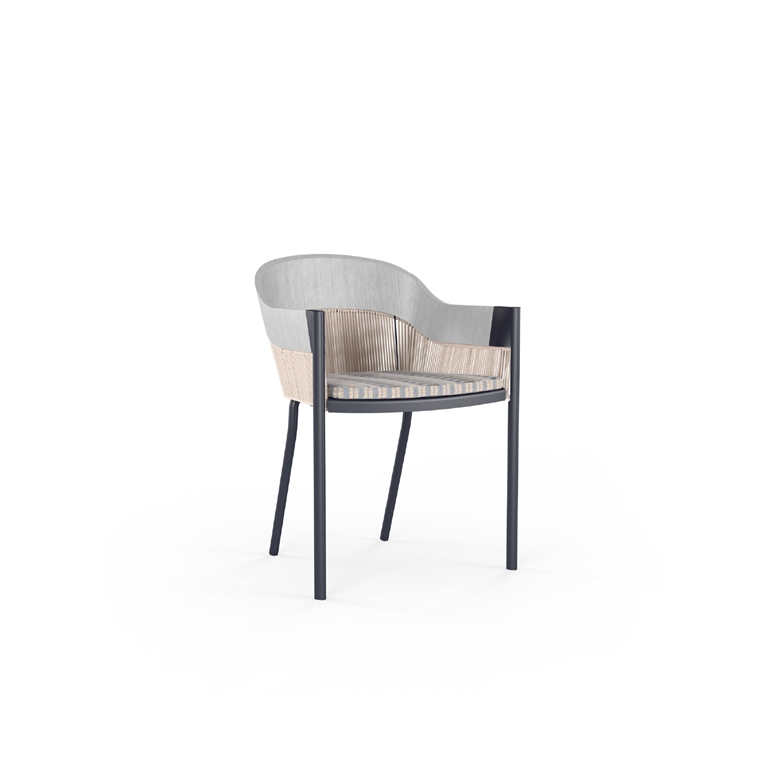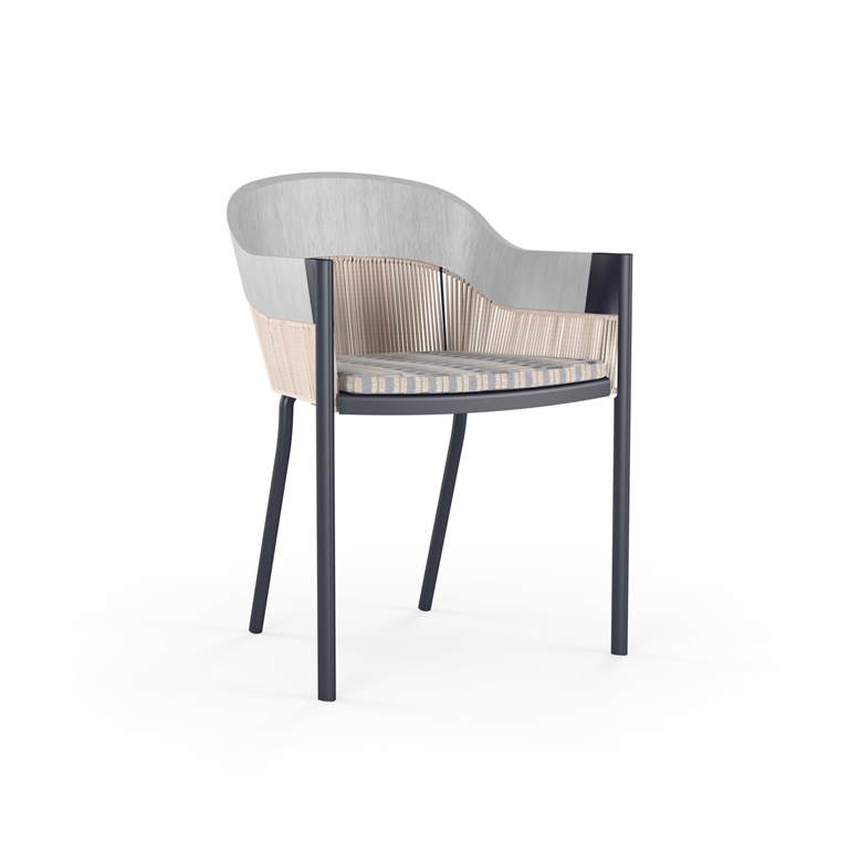 The Kenda chair highlights enveloping shapes and it is characterized by the combined use of wood, rope and aluminum.