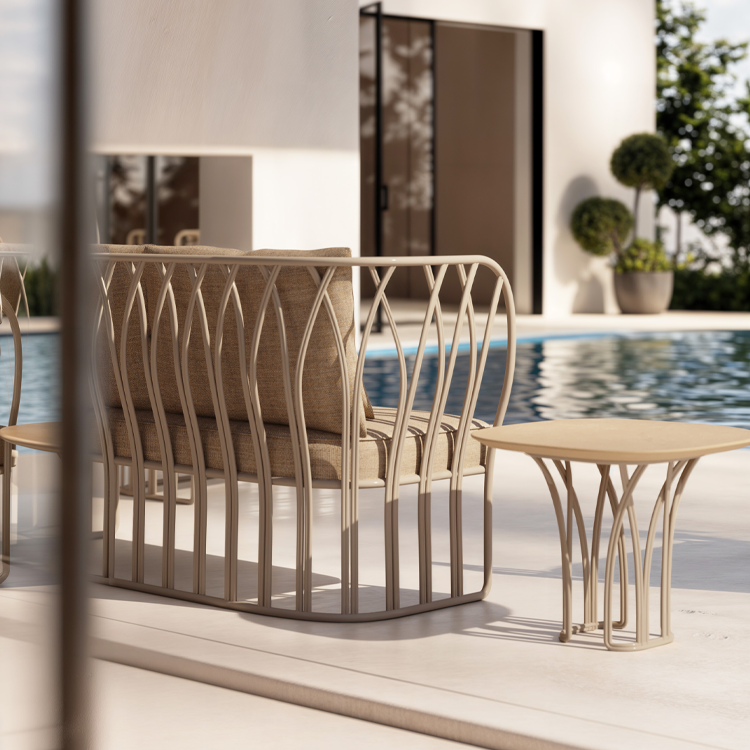 The airy structures are made even more inviting by soft outdoor cushions, which add warmth and comfort to the metal’s rigor. Each piece invites relaxation, transforming outdoor spaces into havens of well-being and conviviality.