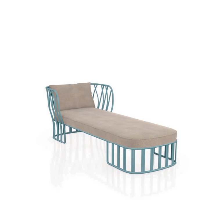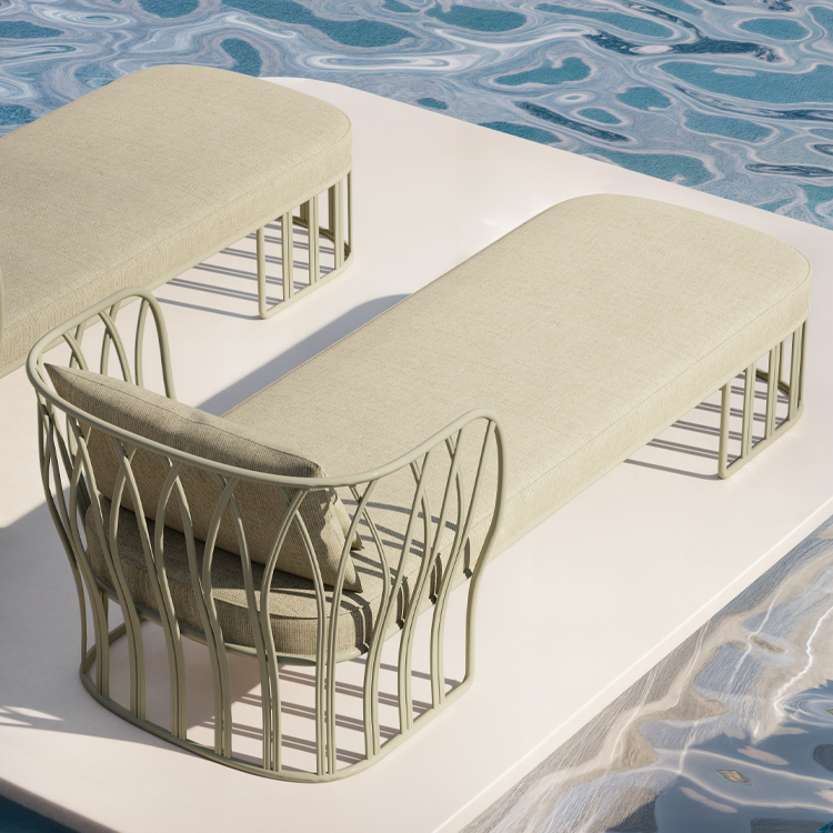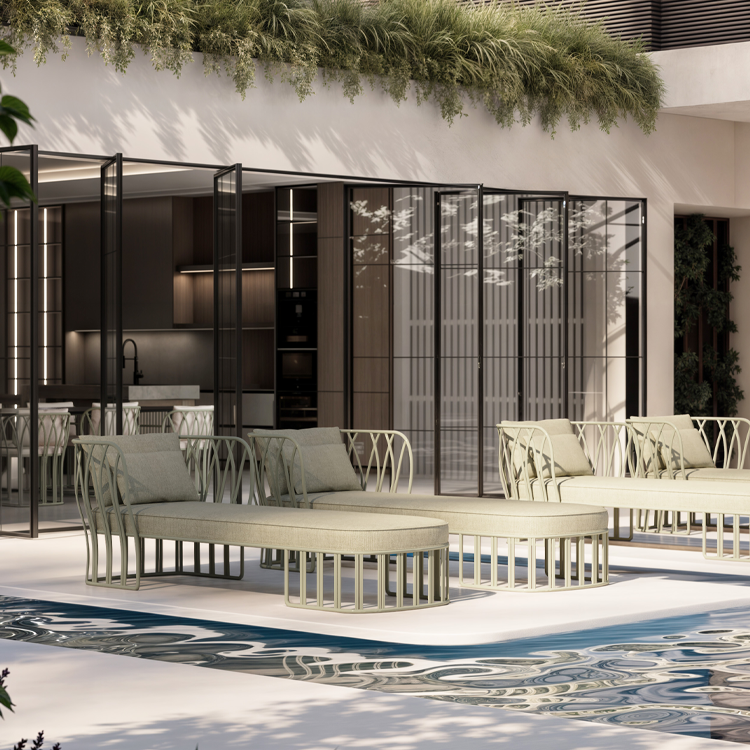 The airy structures are made even more inviting by soft outdoor cushions, which add warmth and comfort to the metal’s rigor. Each piece invites relaxation, transforming outdoor spaces into havens of well-being and conviviality.