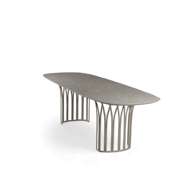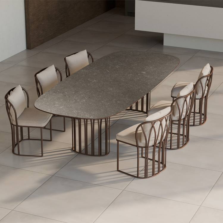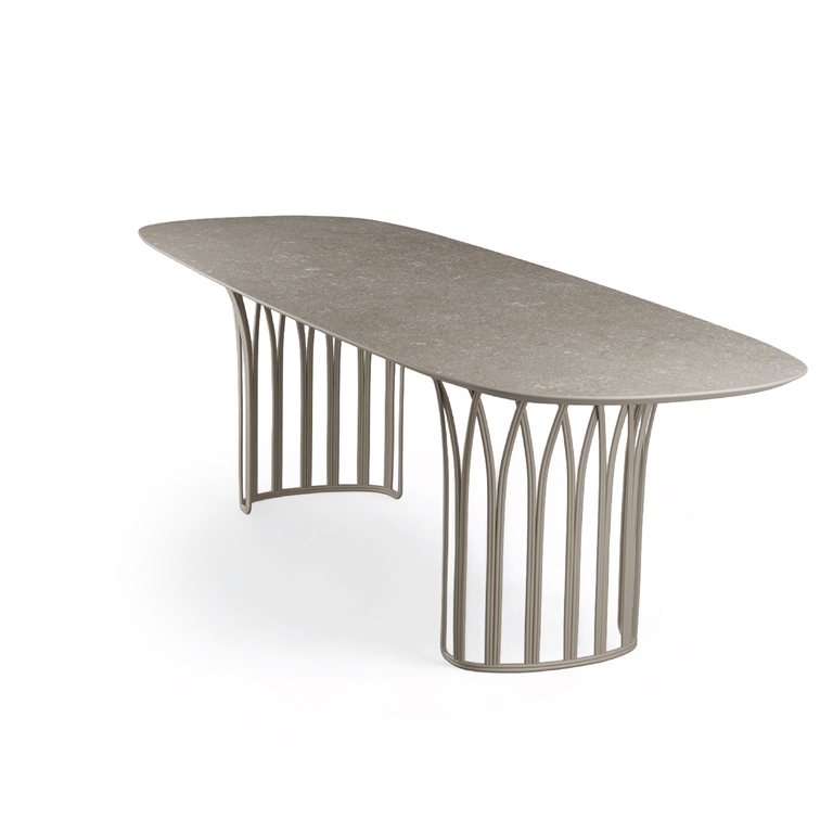 The airy structures are made even more inviting by soft outdoor cushions, which add warmth and comfort to the metal’s rigor. Each piece invites relaxation, transforming outdoor spaces into havens of well-being and conviviality.