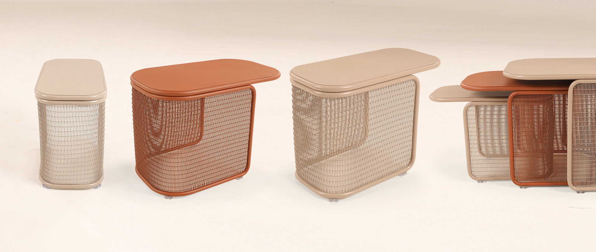 Completed with a mesh produced with a warp and weft logic, just like a textile product, the Prot tables adapt to all kinds of outdoor conditions and decorative settings with Yaaz's unique colors.
