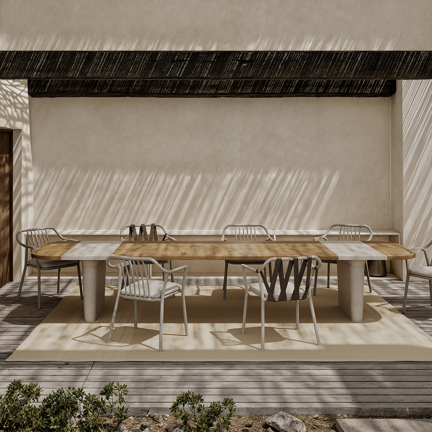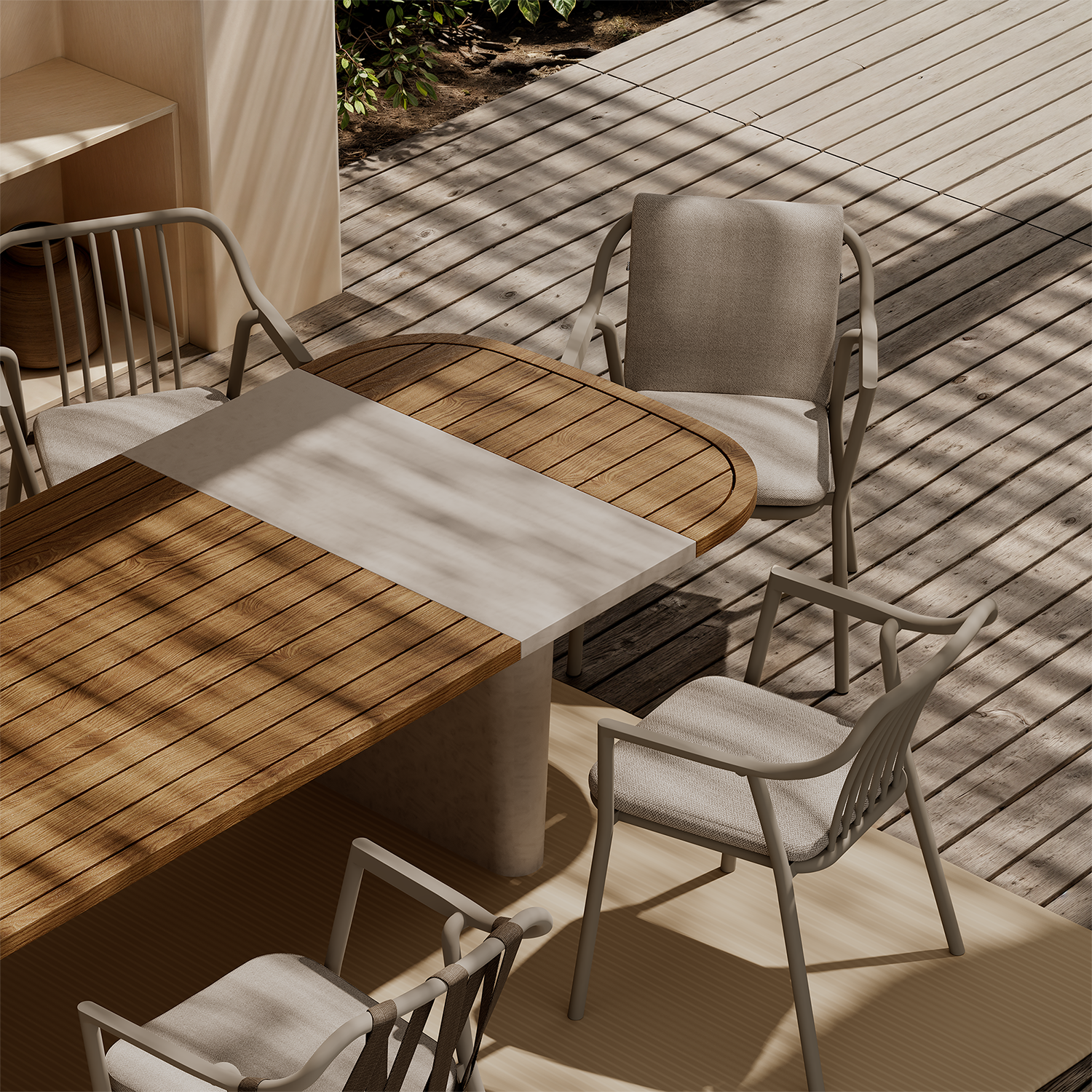 The connecting parts on the legs of SEMT tables made of natural teak wood; aluminum and fiber mixture casting material produced with a special molding method, is completed with sprayed concrete material that provides resistance to bad weather conditions and intensive use.