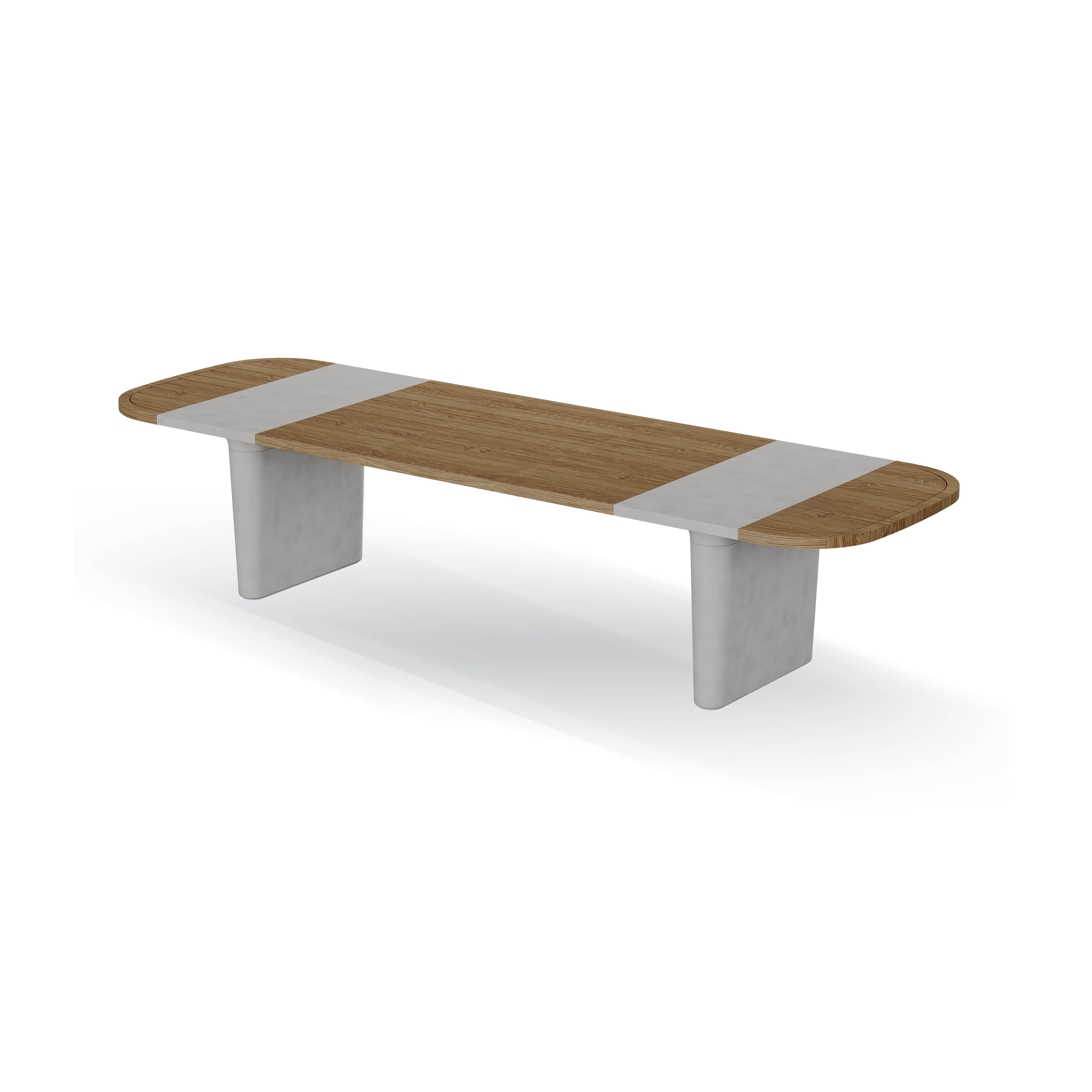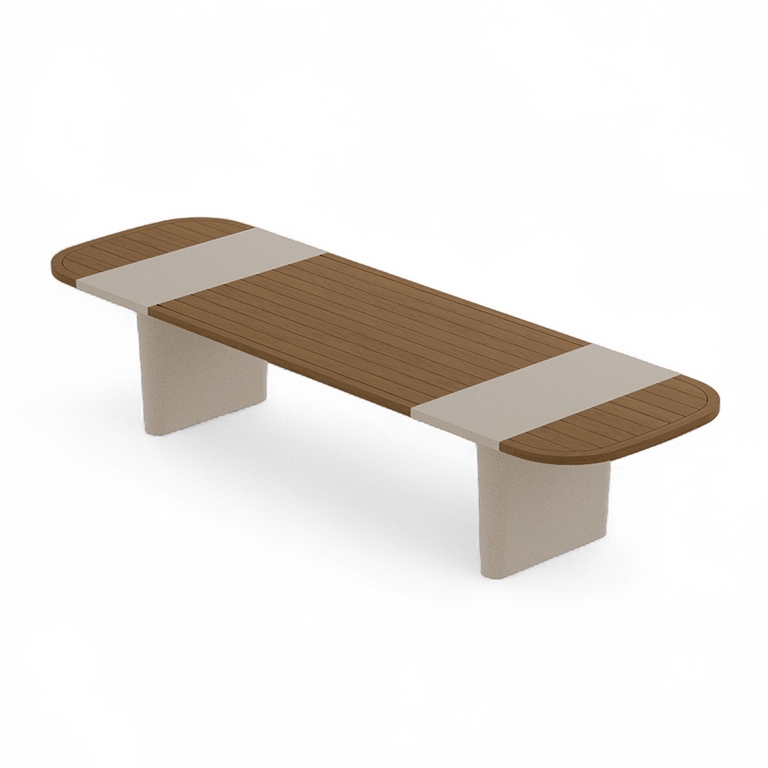 The connecting parts on the legs of SEMT tables made of natural teak wood; aluminum and fiber mixture casting material produced with a special molding method, is completed with sprayed concrete material that provides resistance to bad weather conditions and intensive use.