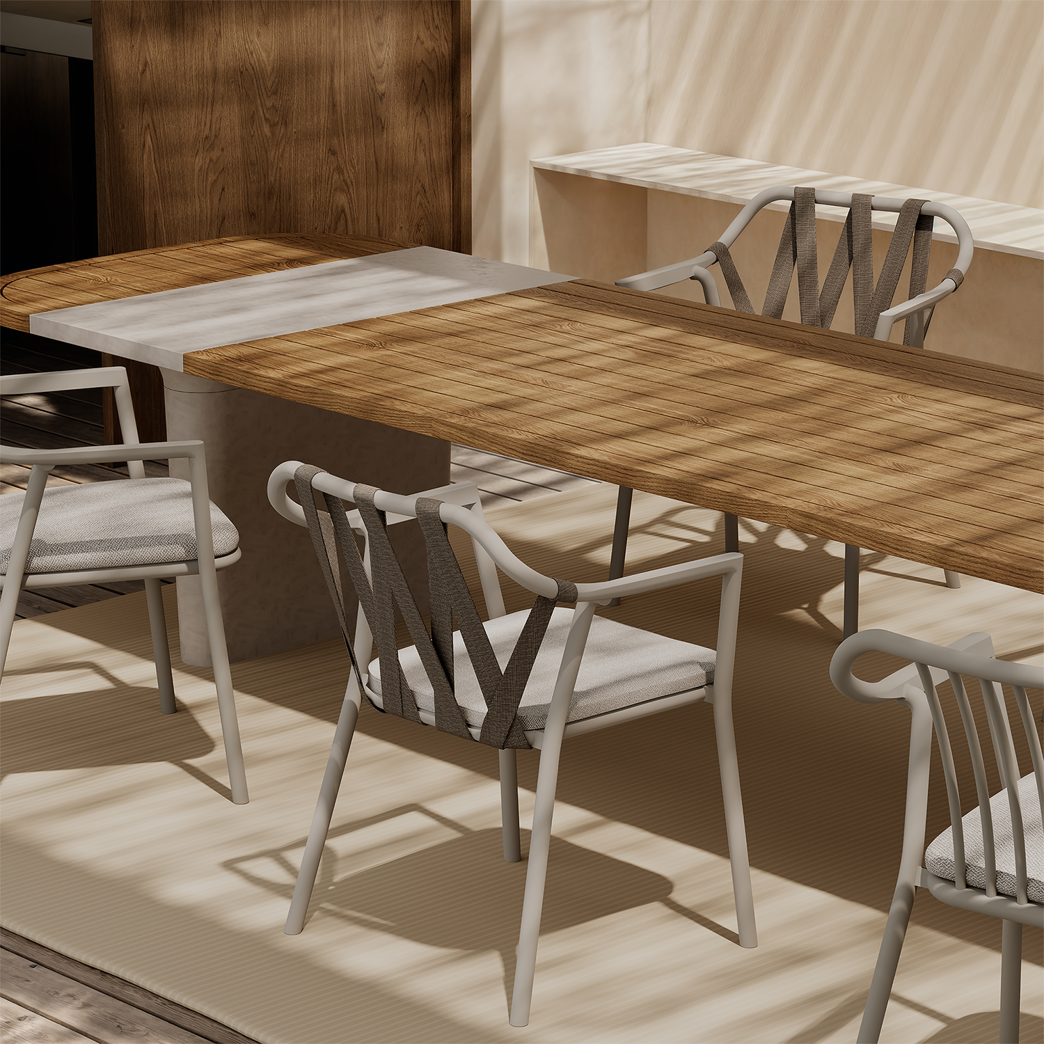 The connecting parts on the legs of SEMT tables made of natural teak wood; aluminum and fiber mixture casting material produced with a special molding method, is completed with sprayed concrete material that provides resistance to bad weather conditions and intensive use.