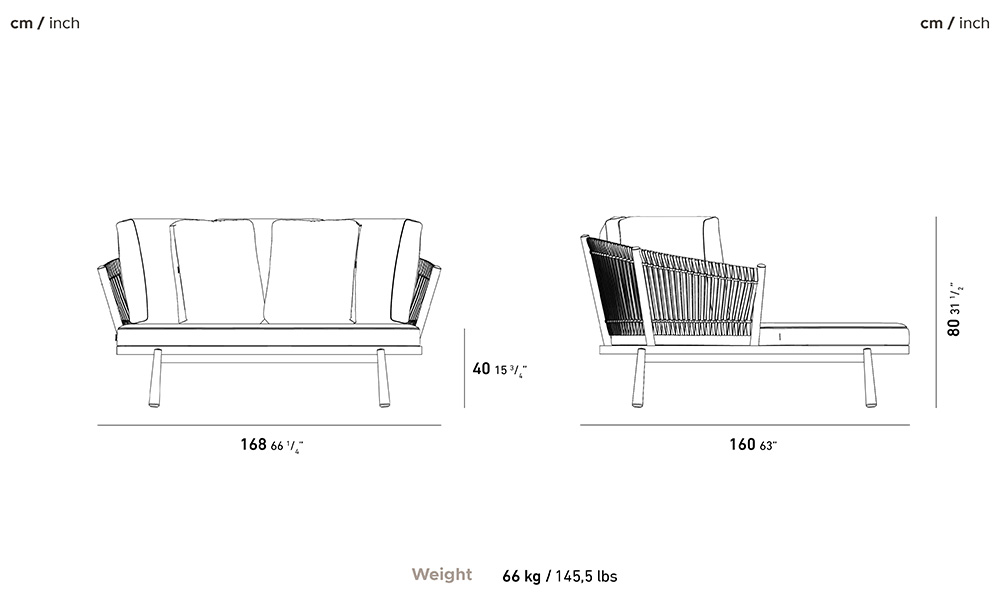 The backrests of the daybed in the TURTLE collection are available in either aluminum or a combination of aluminum and woven ropes.