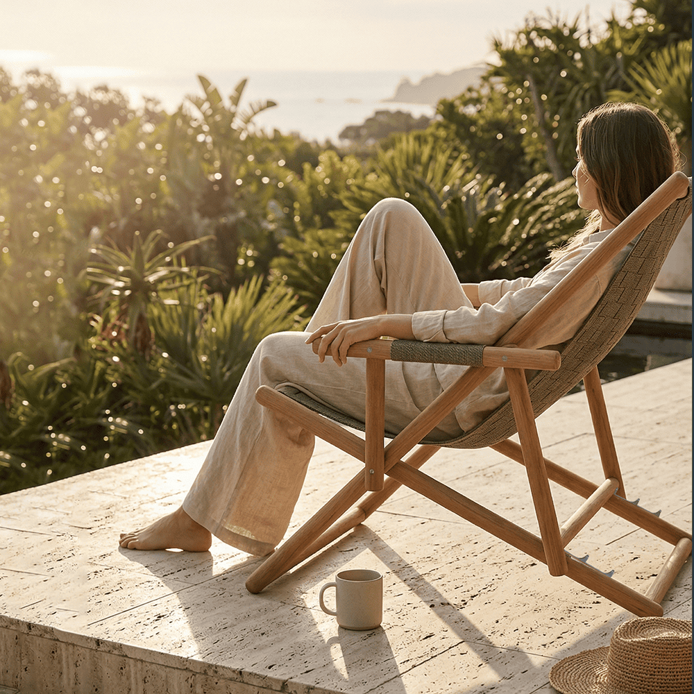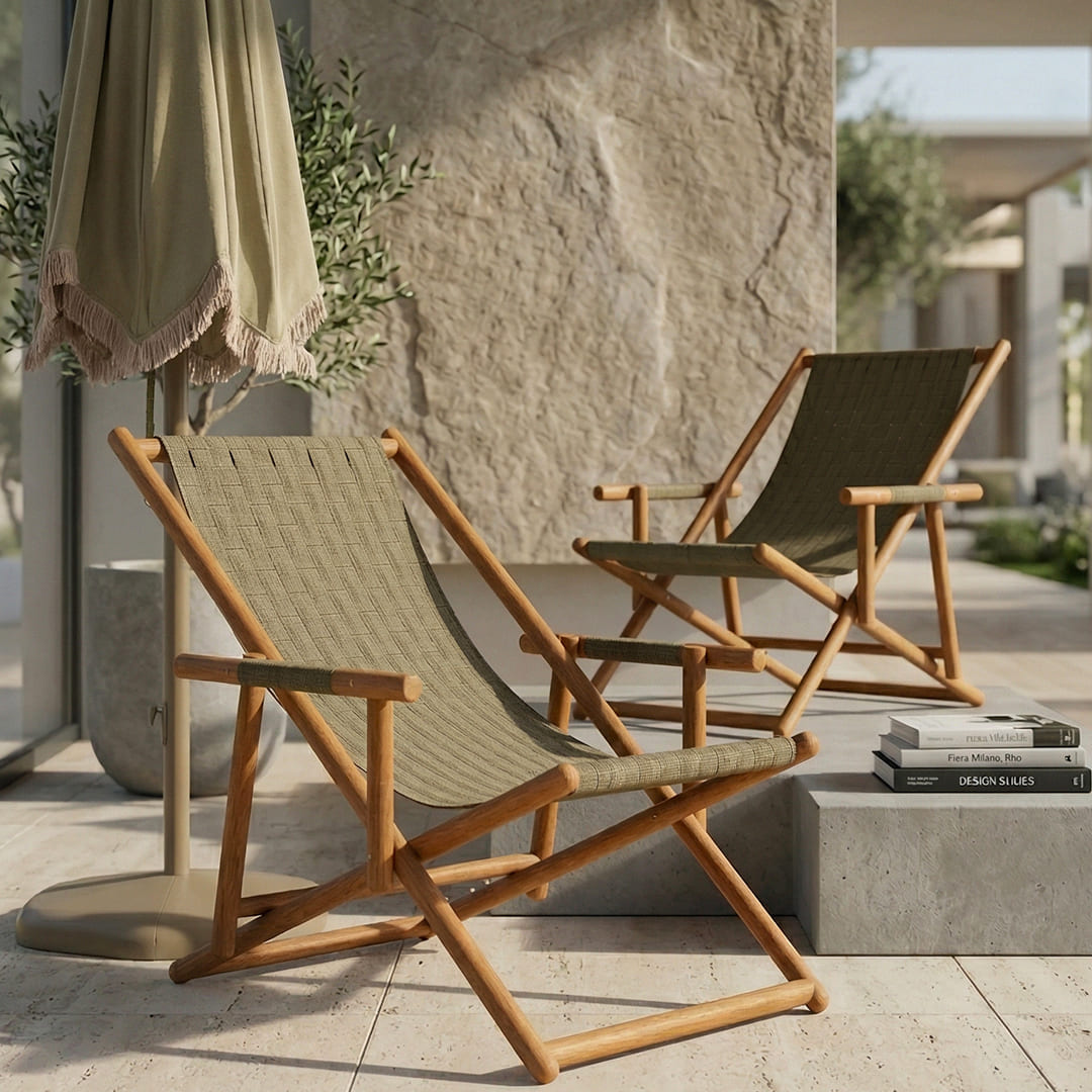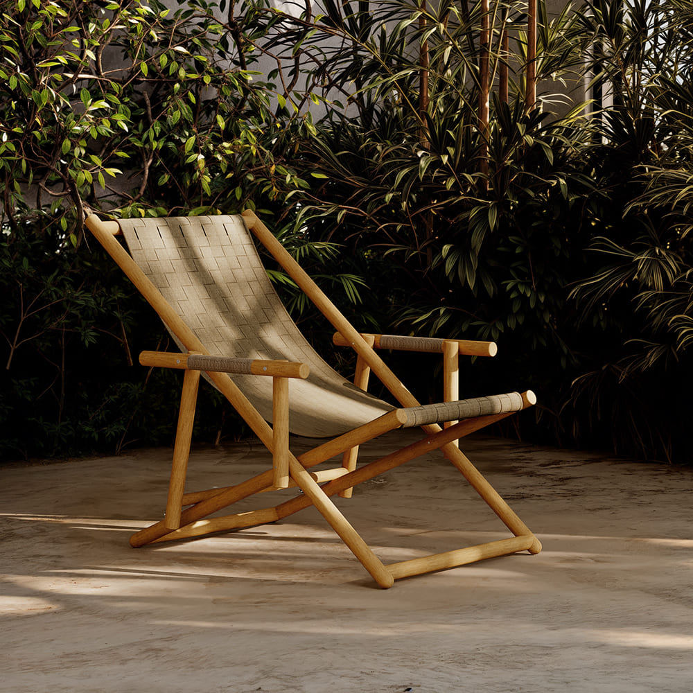 The memory of travel and the desire to reconnect with nature take shape in the UZ Deck Chair, a foldable lounger that combines functionality, design research, and a refined aesthetic. The solid teak frame, characterized by a