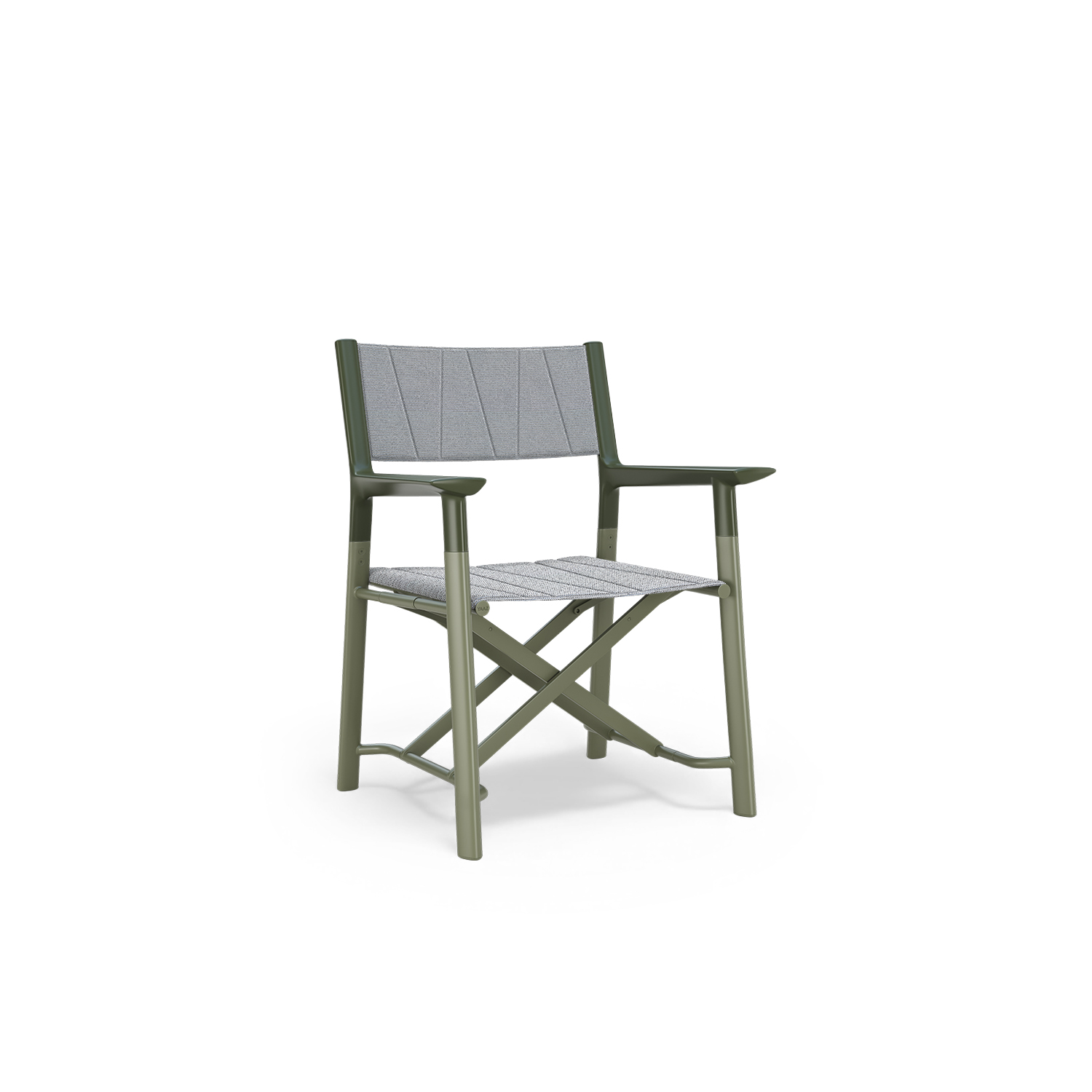 The folding chair draws inspiration from the historical furniture of noble country estates. Made from aluminum, this product evokes the refined and charming holiday destinations of a bygone era. The legs and the armrests are each triangular in section, with flared armrests for enhanced comfort. The seating section, composed of quilted and padded bands, presents a textured visual display, while the seat back is created by weaving technical fabrics of Serge Ferrari brand. The chair is available in a wide range of colors and offers optional integrated accessories such as side tables, sunshade canopy and floor lamp.