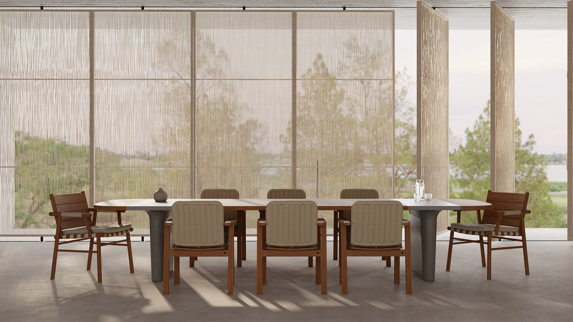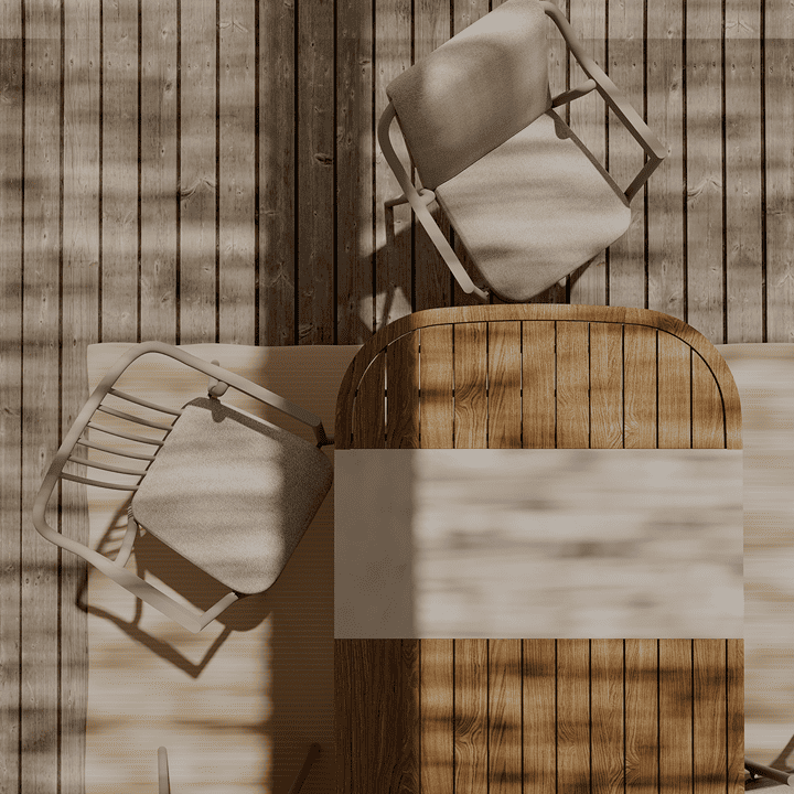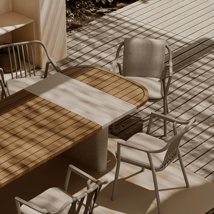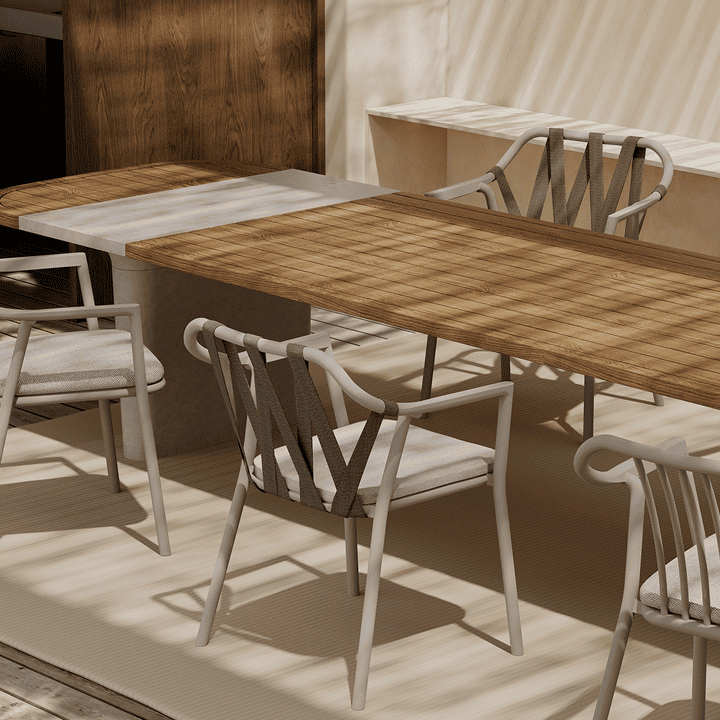 The table’s supporting structure is composed of a single die-cast aluminum module, providing stability, lightness, and a seamless, elegant form. By adding additional modules and extending the teak tops, the table can reach larger dimensions while ensuring easier storage, transport, and recycling.