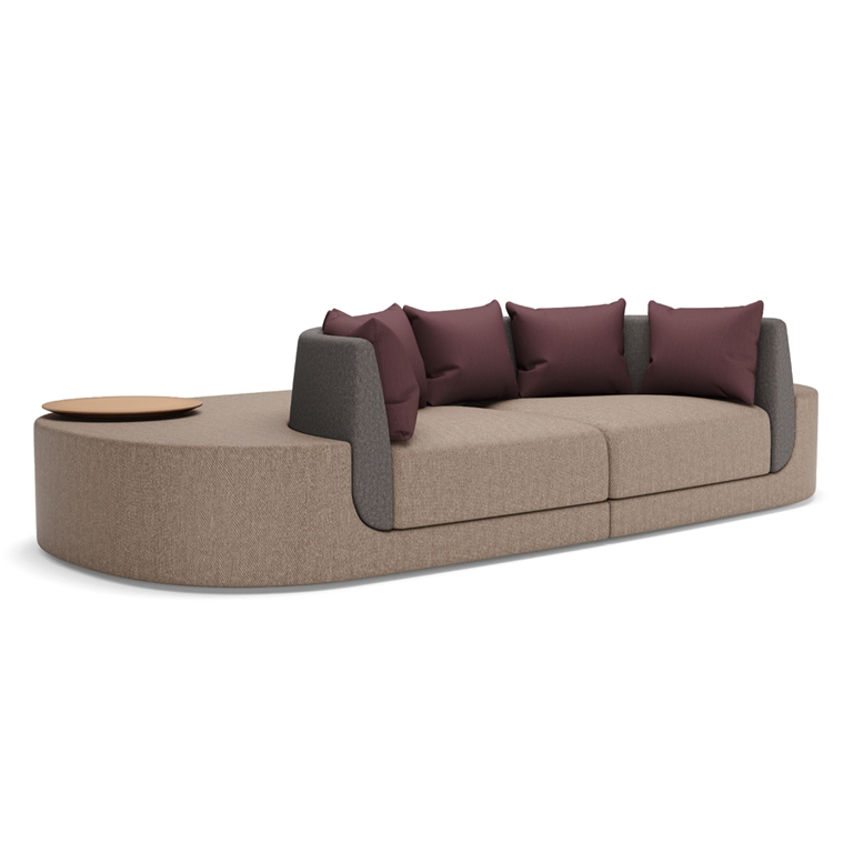 There is a fixed serving tray made of natural teak wood on the hard seat side.