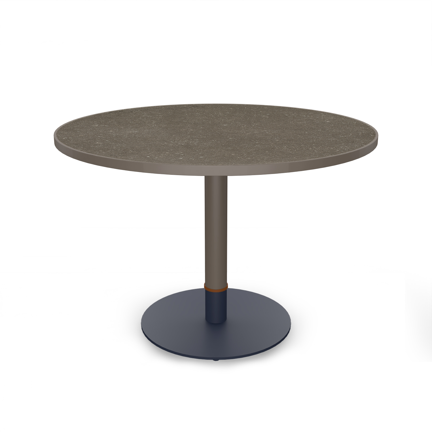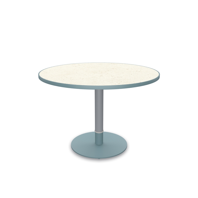 The table leg, which consists of 3 pieces, can be configured with different color combinations. The part that sits on the base is made of heavy-duty stainless material that is resistant to weather conditions. Aluminum, natural ceramic and paviment alternatives are available for the table.