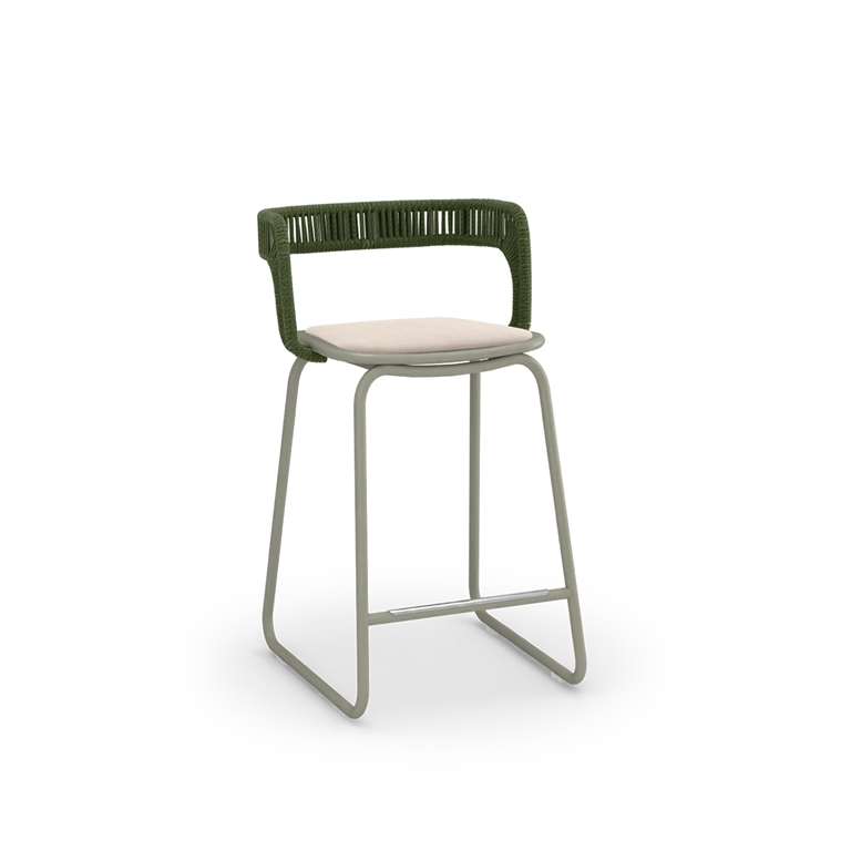BARLA stools made of aluminum and with rope backrest are available in two heights.