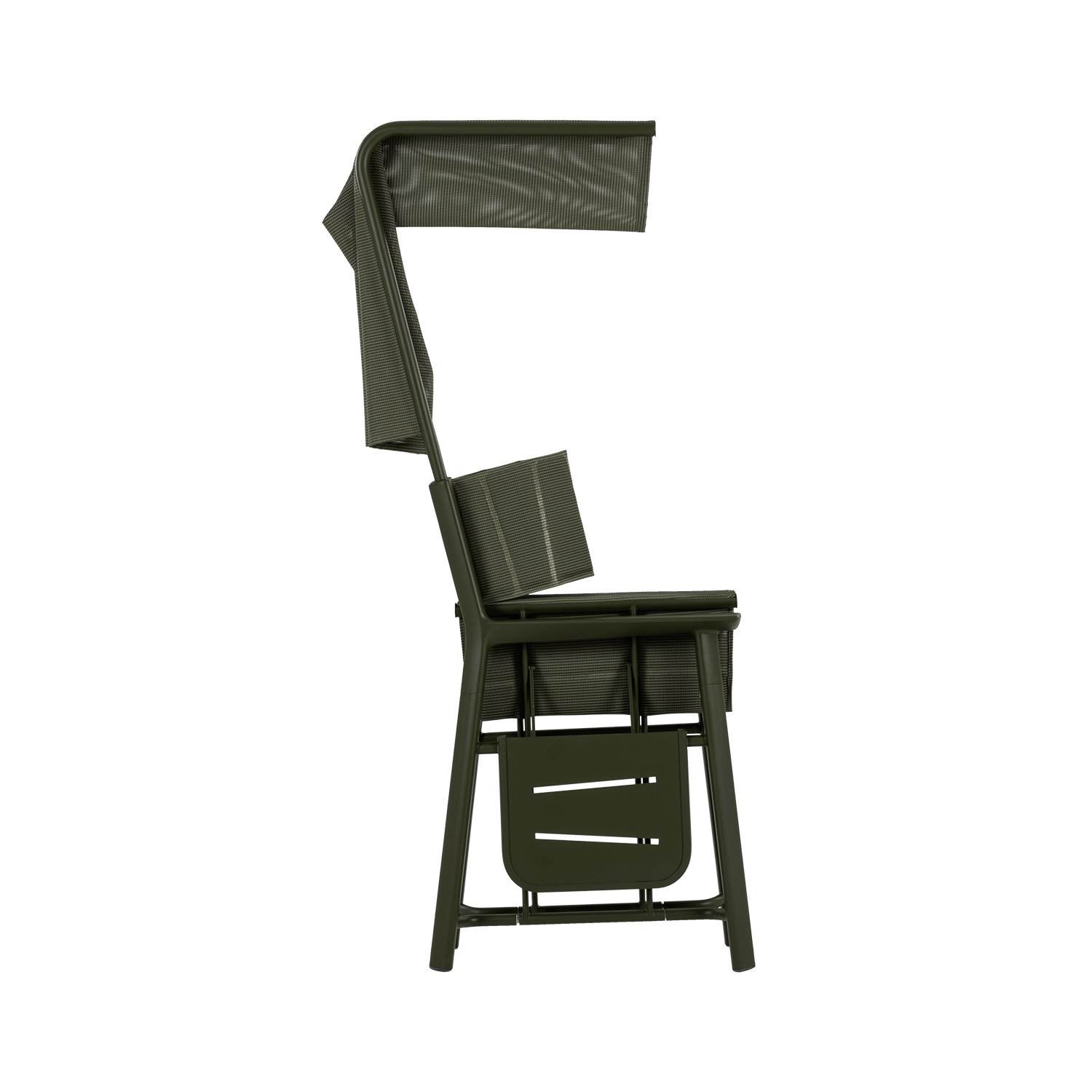 The collection is made of aluminum and fabric to guarantee the utmost lightness, interpreting a refined design concept that results in a triangular cross-section of the legs, armrests. The chair, which provides a quilted and padded seat with Serge Ferrari’s fabrics, offers optional integrated accessories with an openable tray or an add-on sunshade.