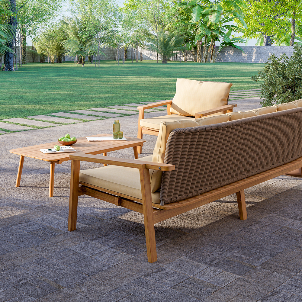 The line includes chairs, armchairs, and sofas in two sizes, all designed to offer ample seating space, perfect for outdoor relaxation. The DENK collection features precise design with timeless allure, where wood, rope, and fabric seamlessly combine style and functionality. It represents the perfect blend of classic teak garden furniture and contemporary form.