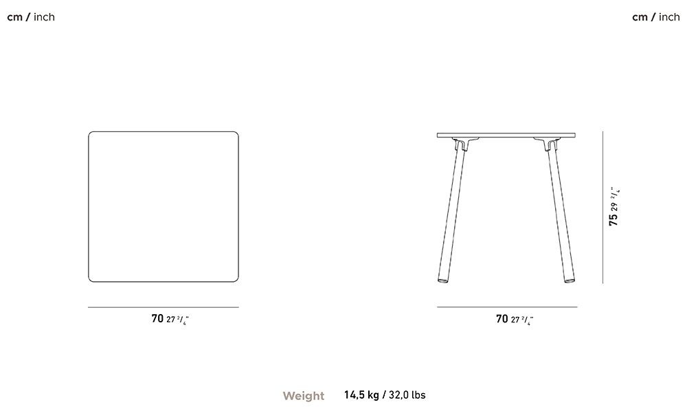 90x90 cm, 70x70 cm and Ø80 cm in diameter.
