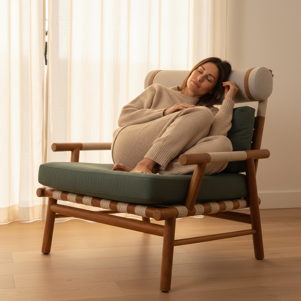 The seatback of the chair is enriched with a headrest cushion offering a soft support which allows you to rest your head comfortably, favoring a sense of casual relaxation. It is completed with stylish accessories such as headrest cushion, aged leather straps and wooden buttons.